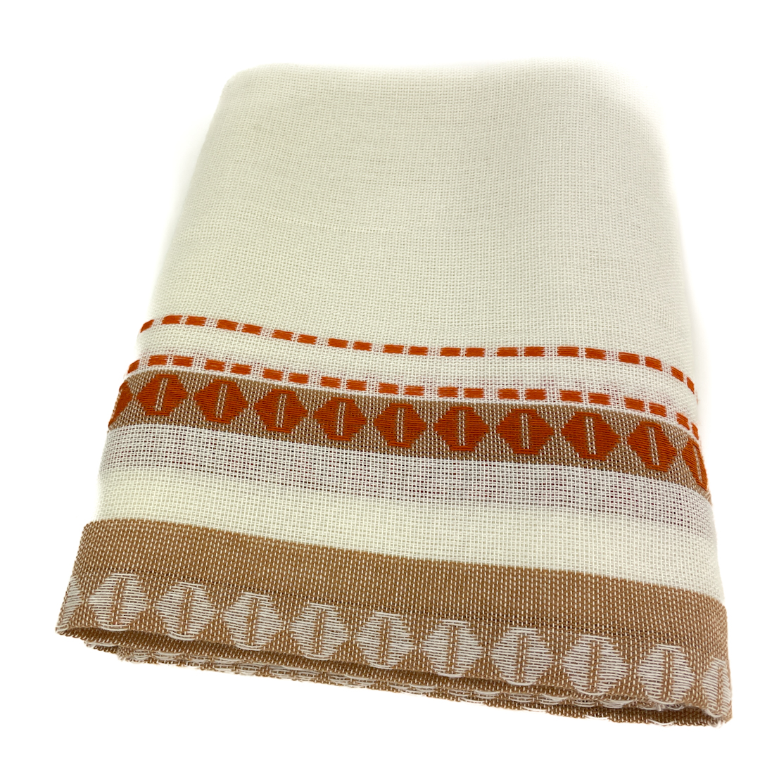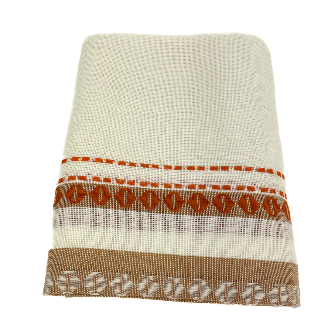 Dugen er vævet i beige og hvid med dekorative borter i orange og brunlige nuancer med grafisk mønster.