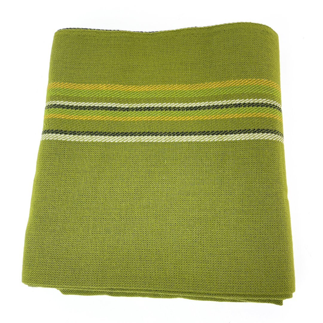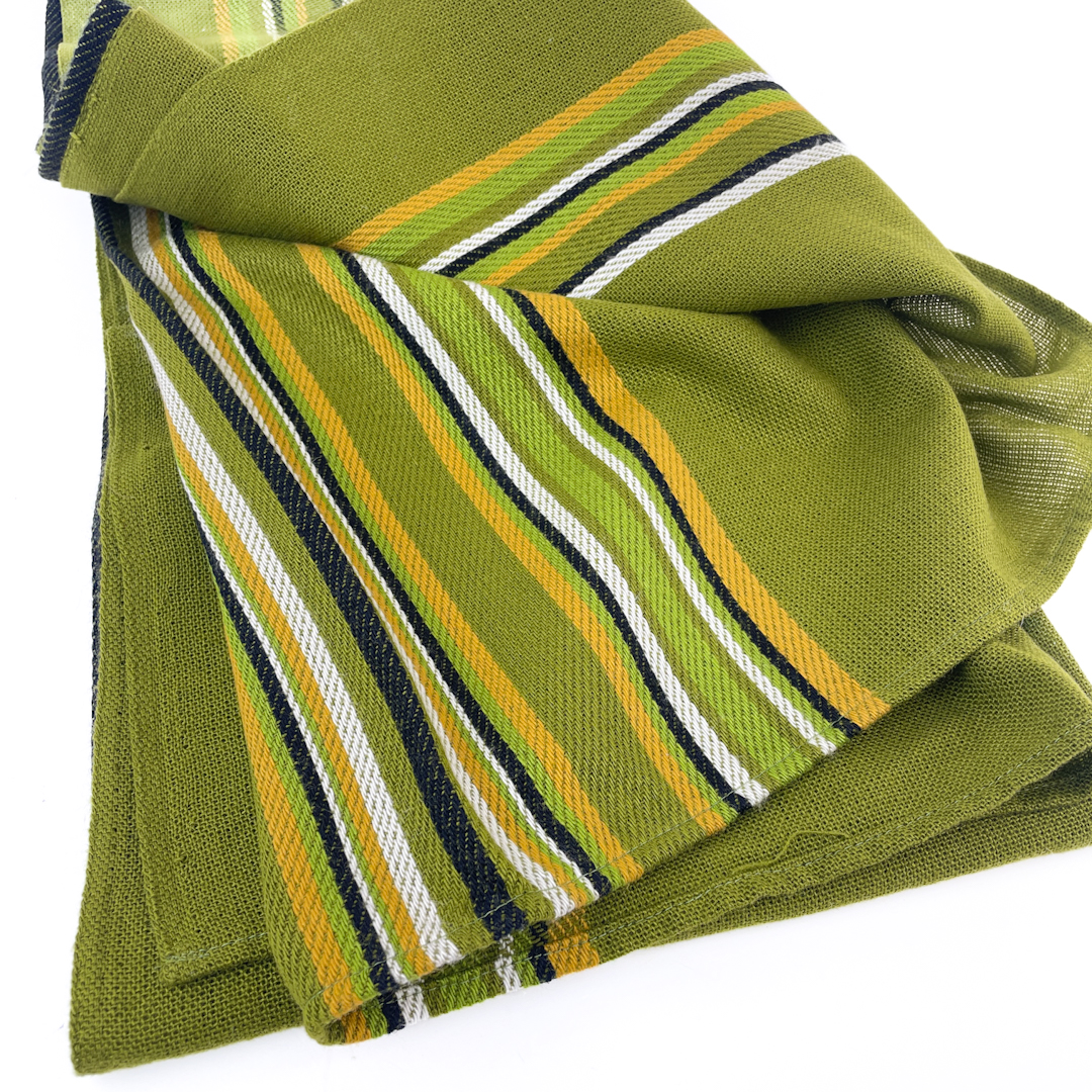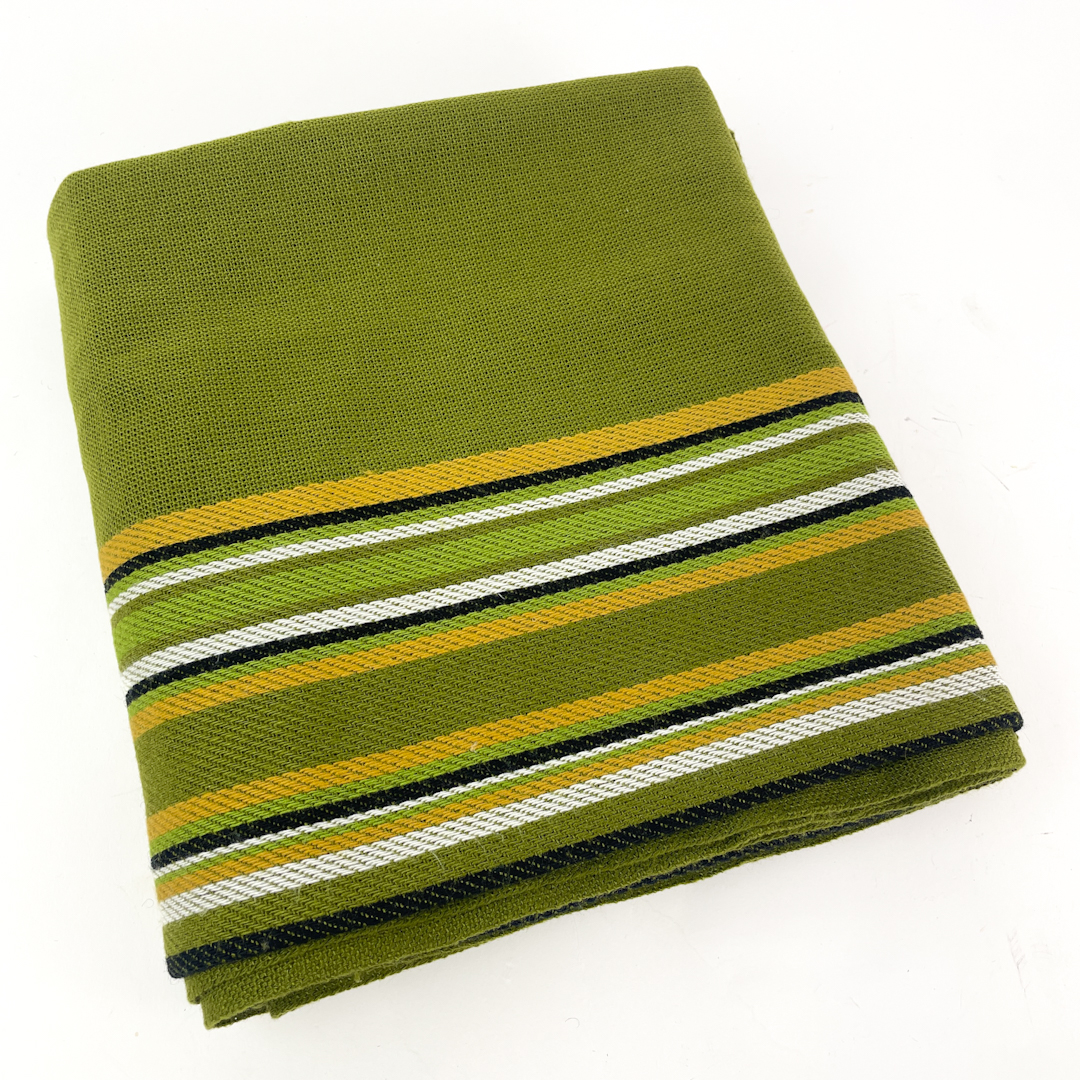 Flot grøn retro dug i strygefri kvalitet med vævede striber i gule, hvide, mørkegrønne og lime nuancer.