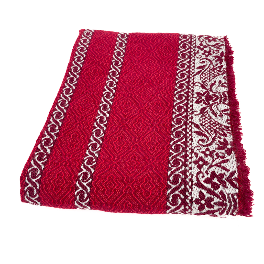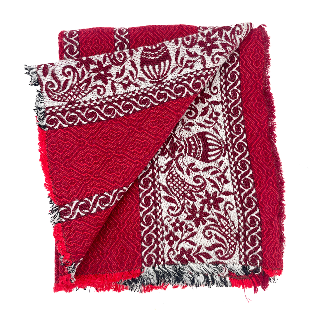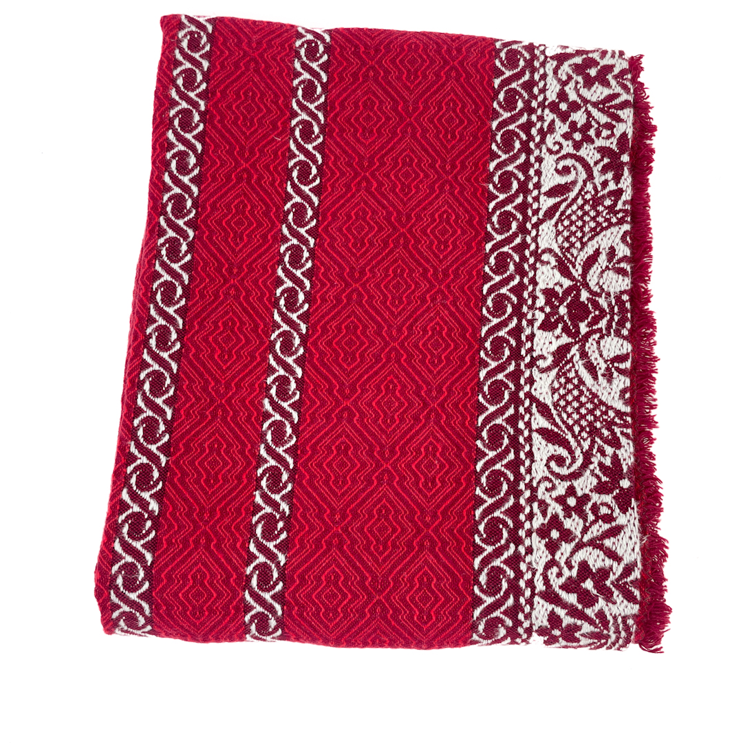Flot rød retro dug i kraftig vævet bomuld med klassisk geometrisk mønster og dekorative borter i hvid og mørkerød.