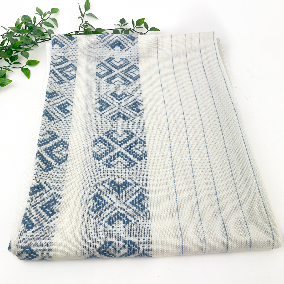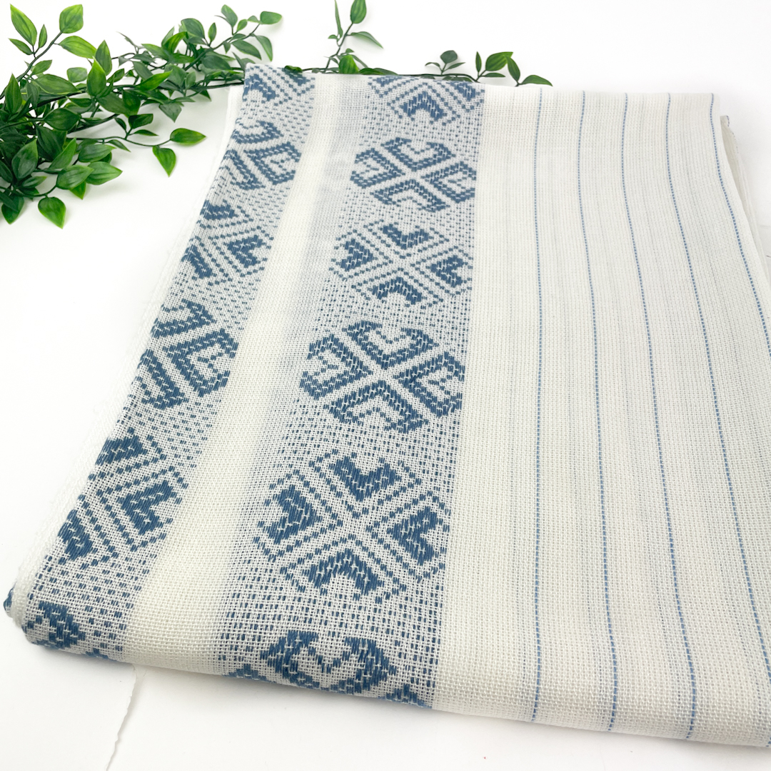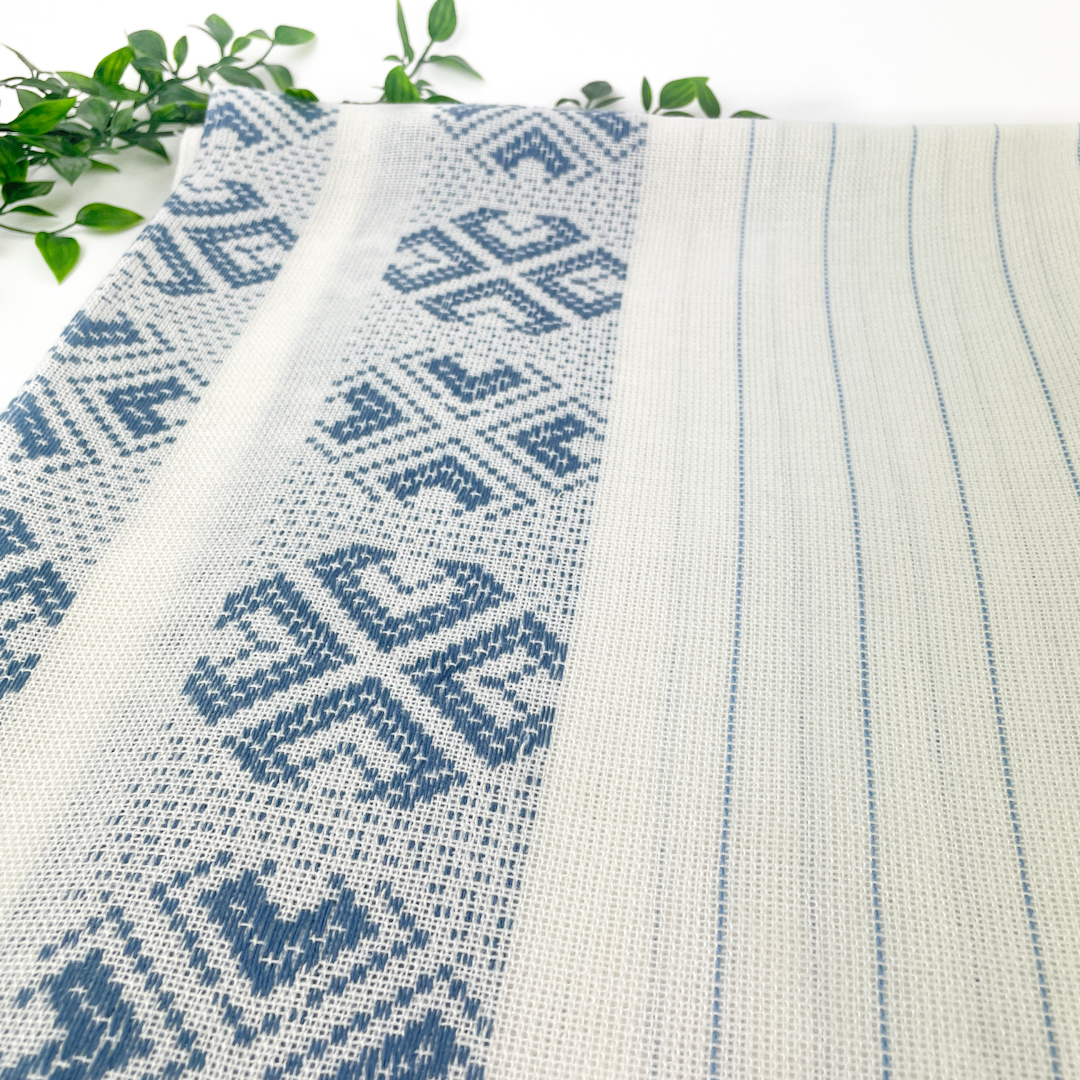 Smuk blå og hvid retro dug med vævet mønster og smalle striber.