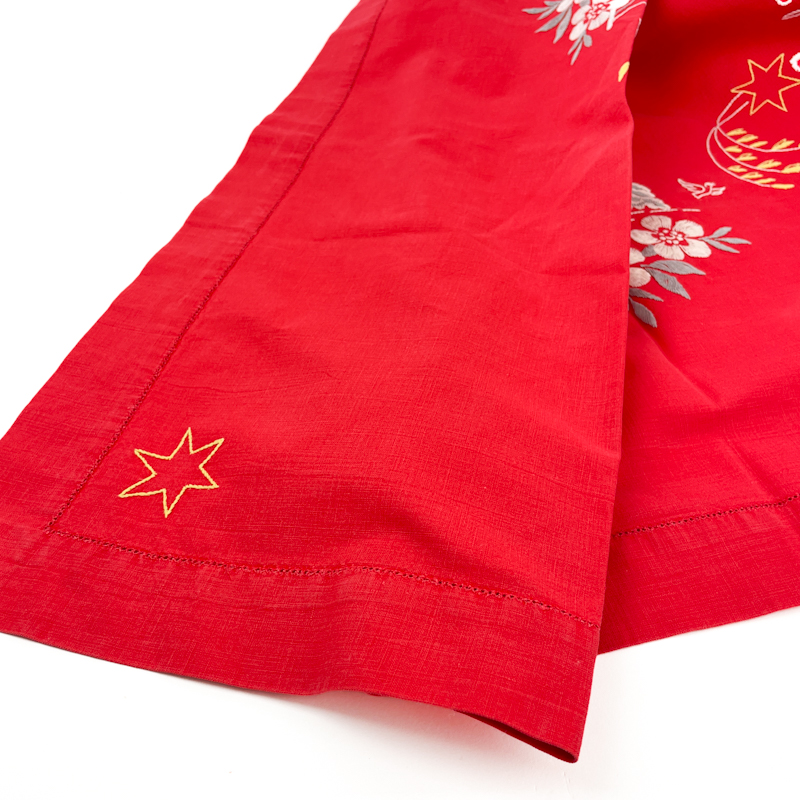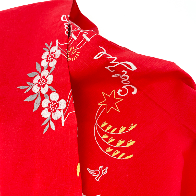Smuk rød vintage juledug i ren bomuld med broderet God Jul og dekorative motiver udført som smukt gammelt håndarbejde.