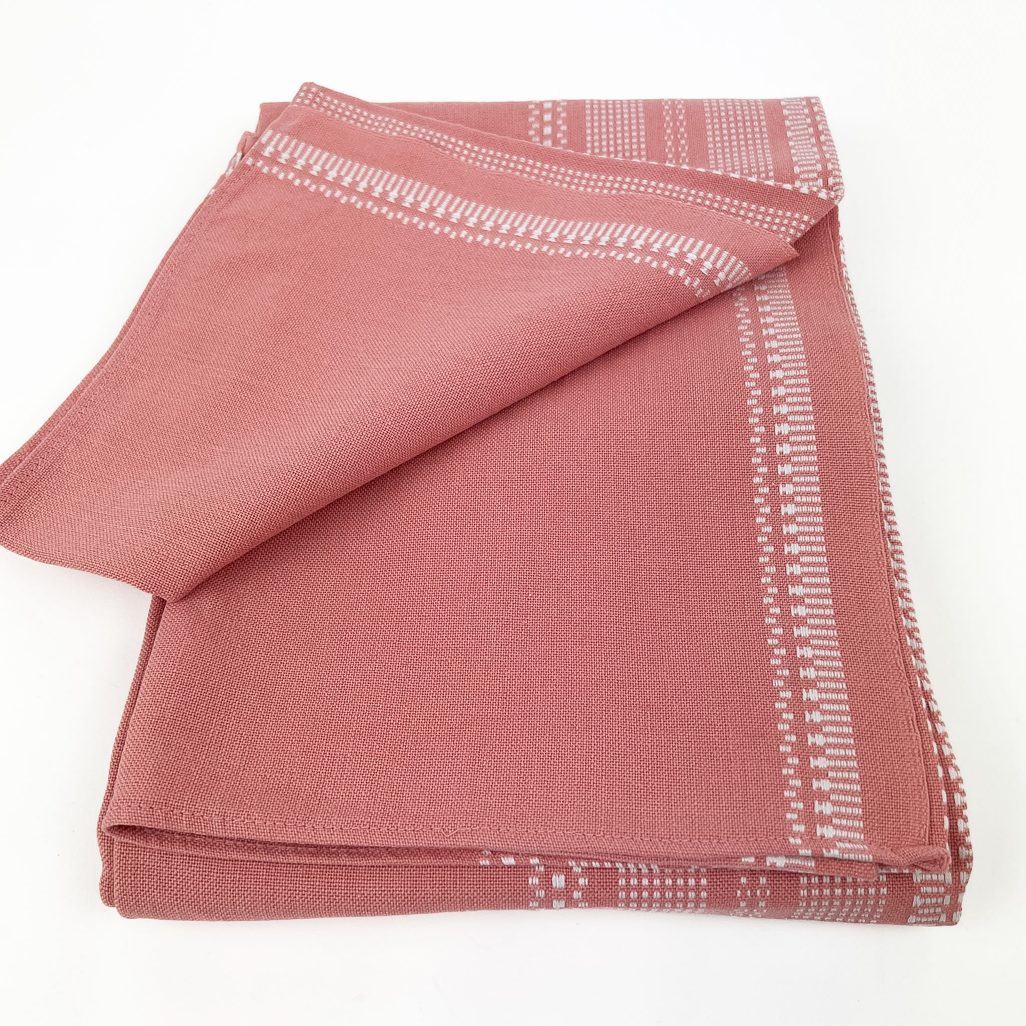 Flot retro dug i rosa med fine hvide vævede mønsterborter langs kanten.