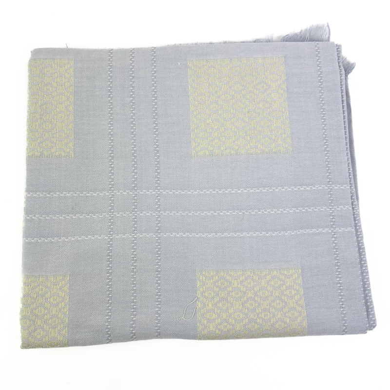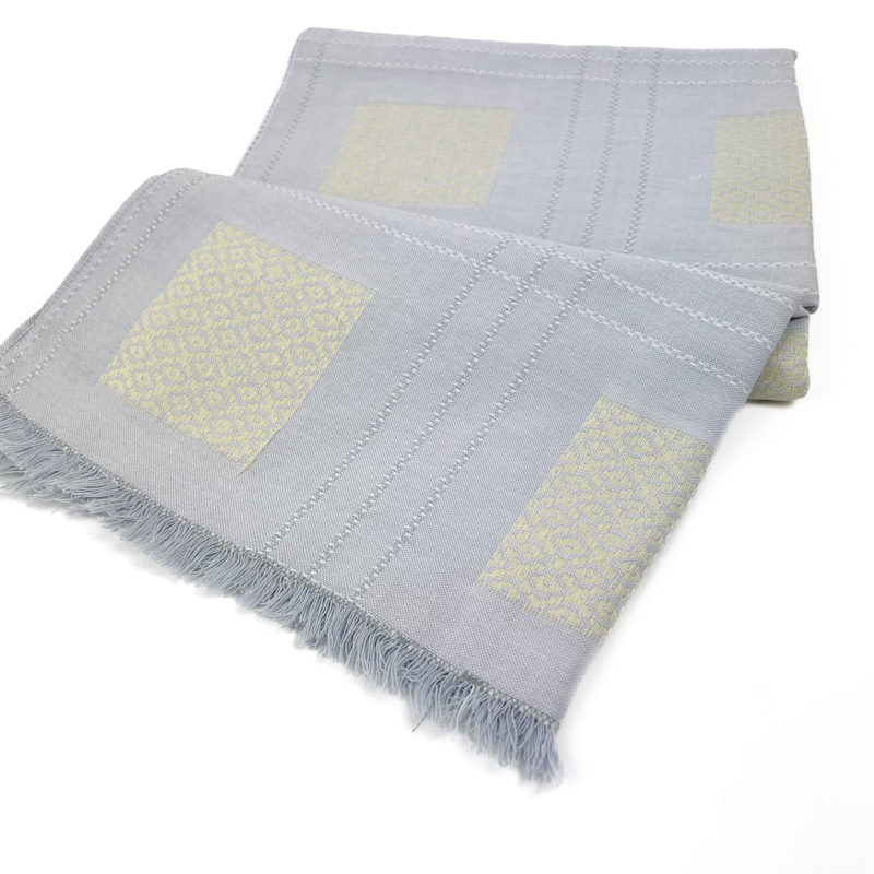 Retro dug i grå tekstil med vævede gule tern og diskret mønster.