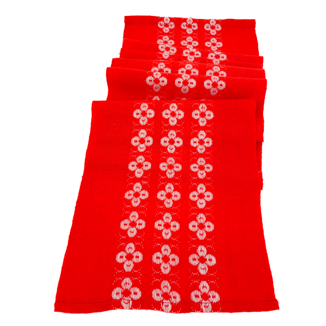 Dekoreret med hvide blomster i striber på klar rød bund.