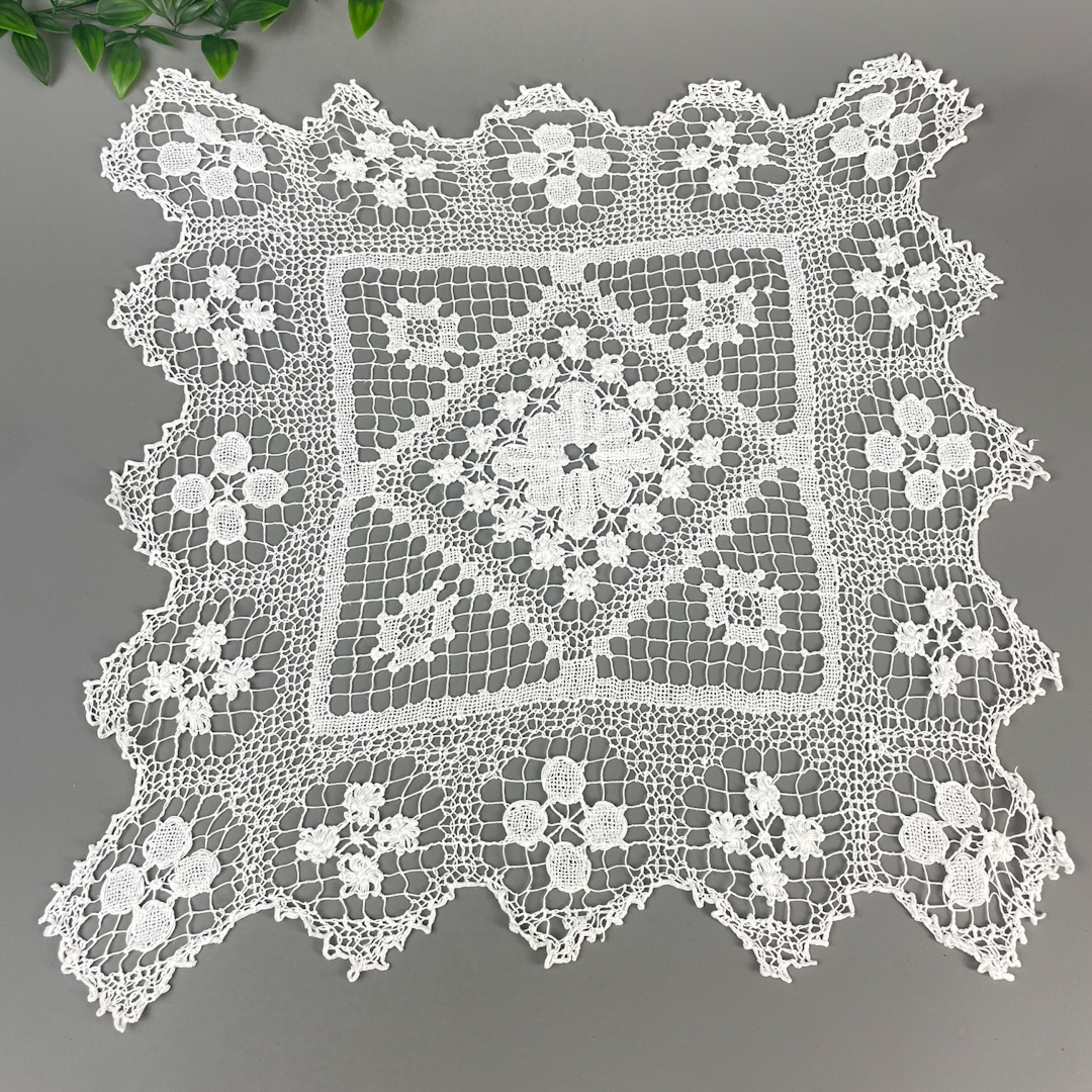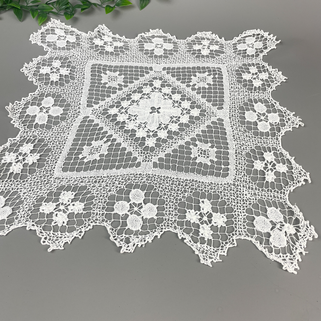 Dugen er kniplet med detaljerede blomster og netmønster samt dekorativ kant hele vejen rundt.