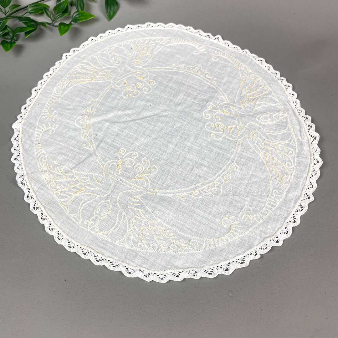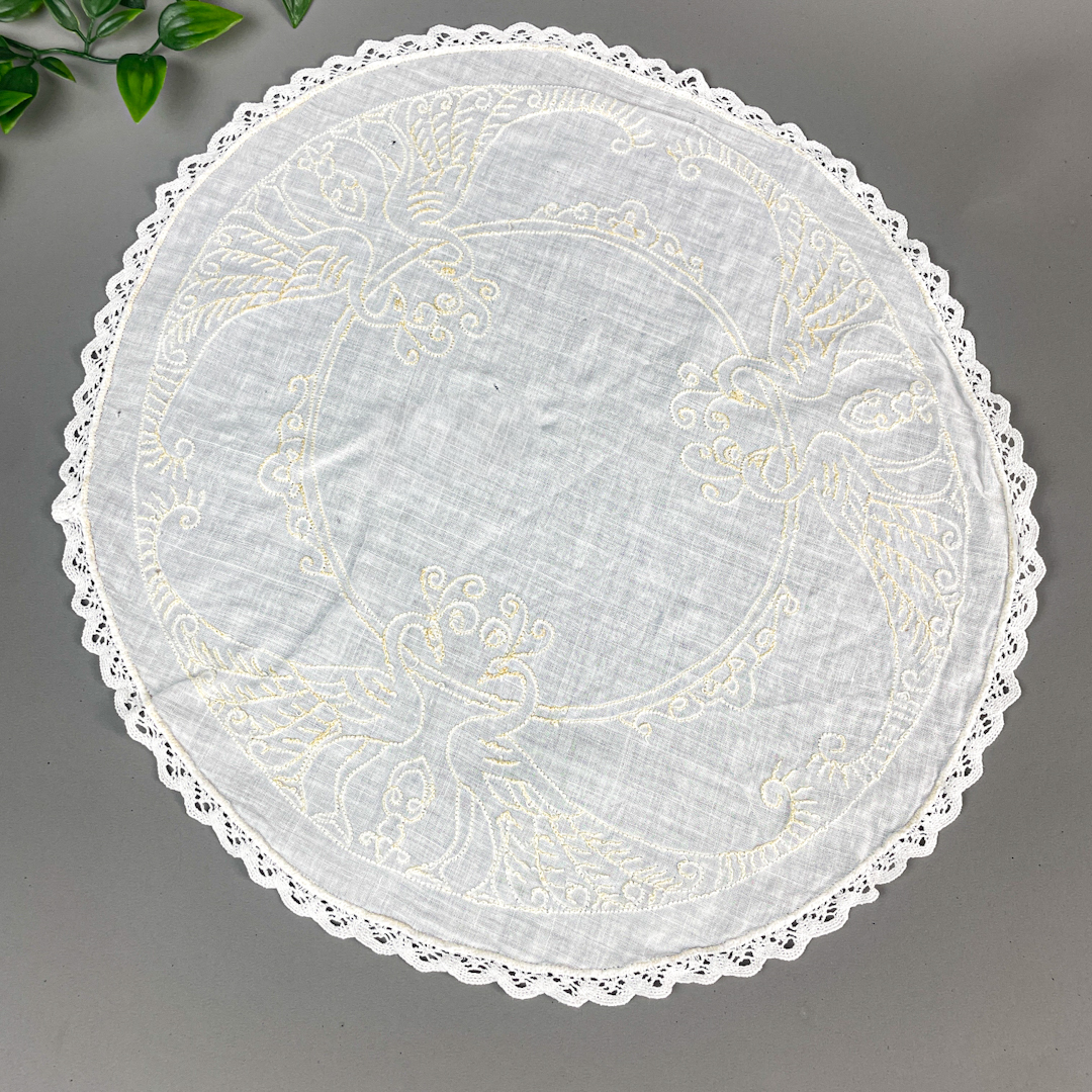 Smuk rund vintage lysedug i fin hvid bomuld med broderede fugle og dekorativ blondekant.