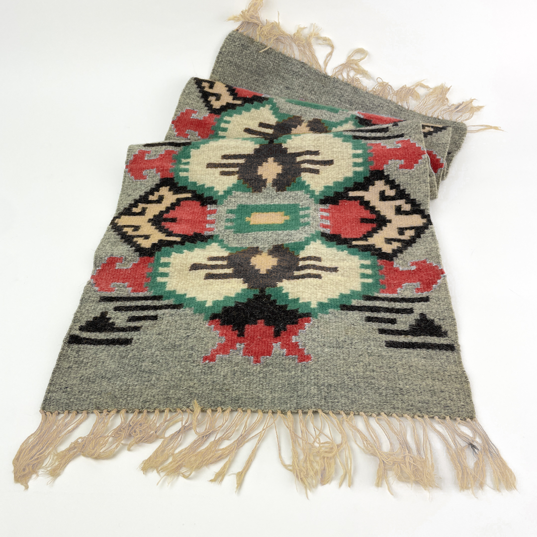 Smukt vintage vævet bordløber med grafisk mønster i grå, grøn, rød, sort og creme.