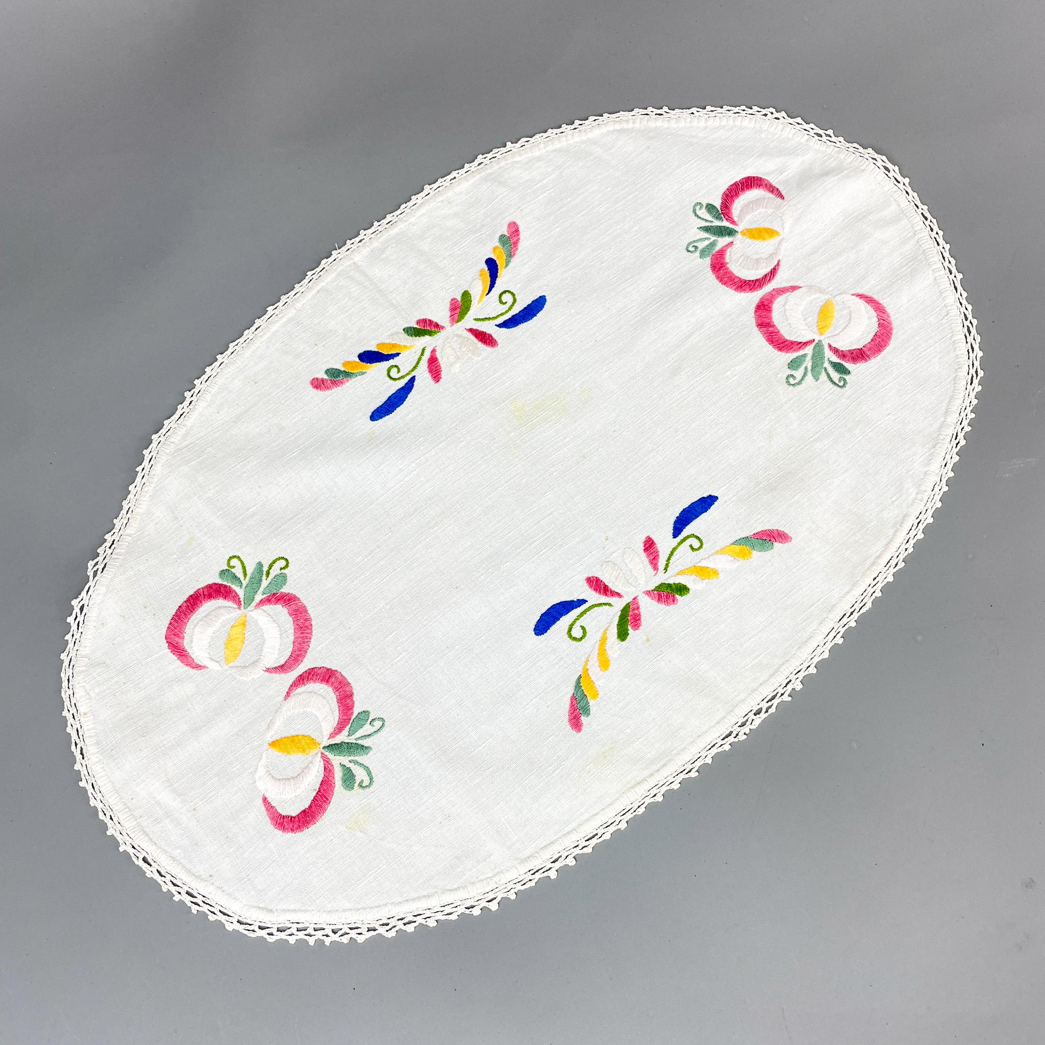 Smuk hvid vintage lysedug med broderede blomster i rosa nuancer og håndhæklet blondekant hele vejen rundt.