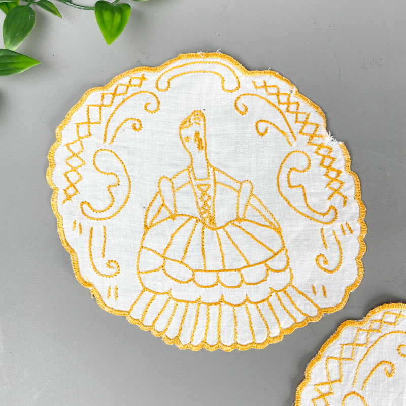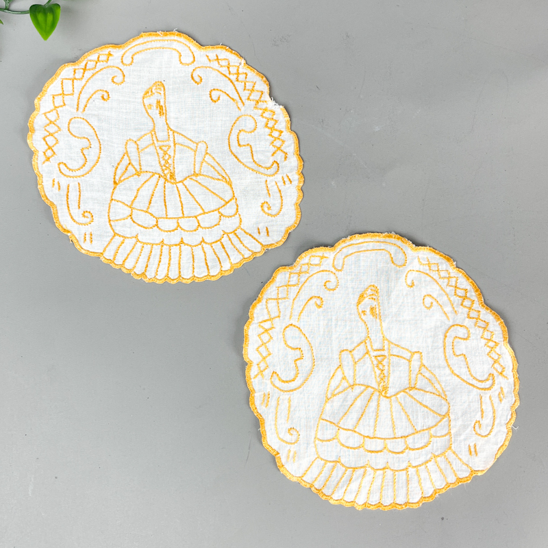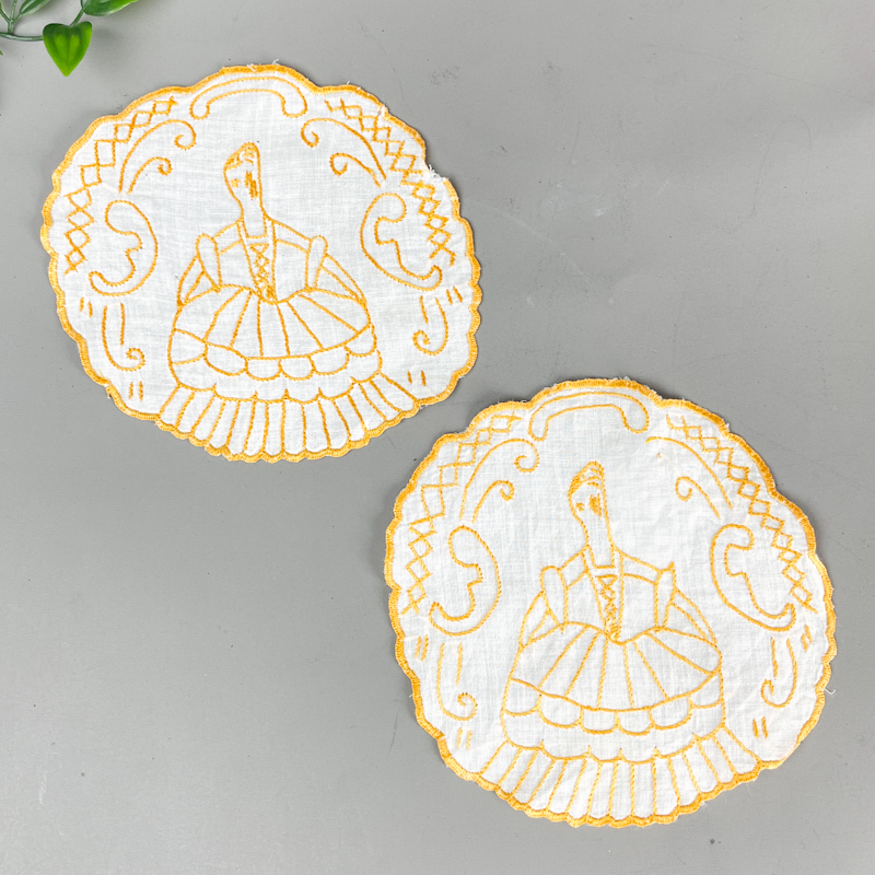 To små runde vintage flakoner i hvid bomuld med gult broderi og dekorativ bort.