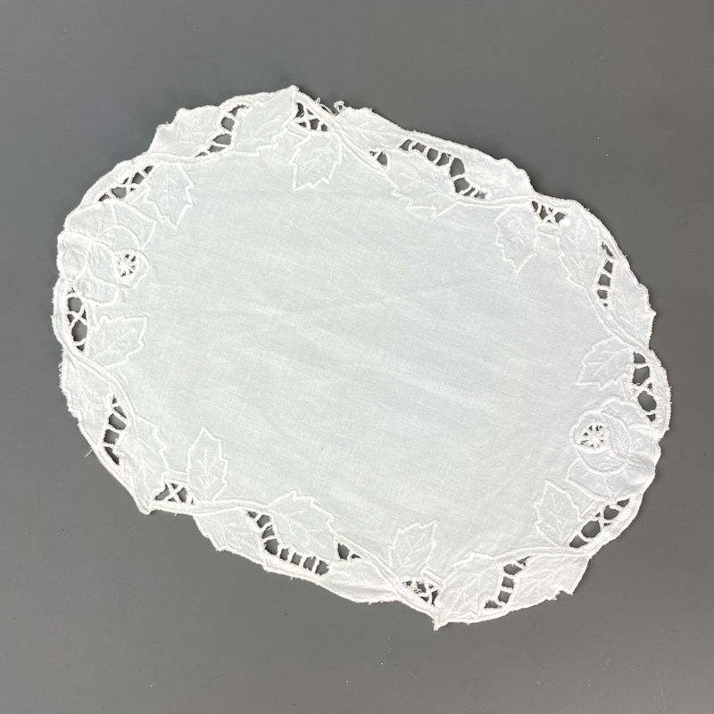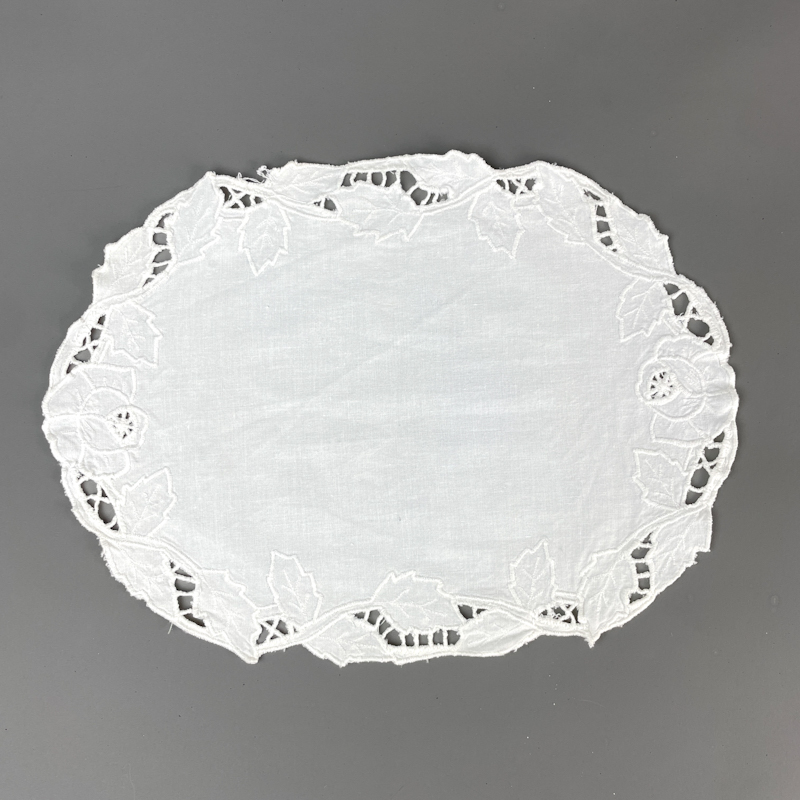 Lysedugen har broderi og mellemværk med bladmønster og en fin, oval form.