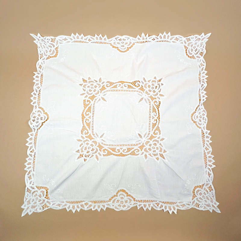 Smuk retro lysedug i hvid bomuld med dekorativ blondekant hele vejen rundt.