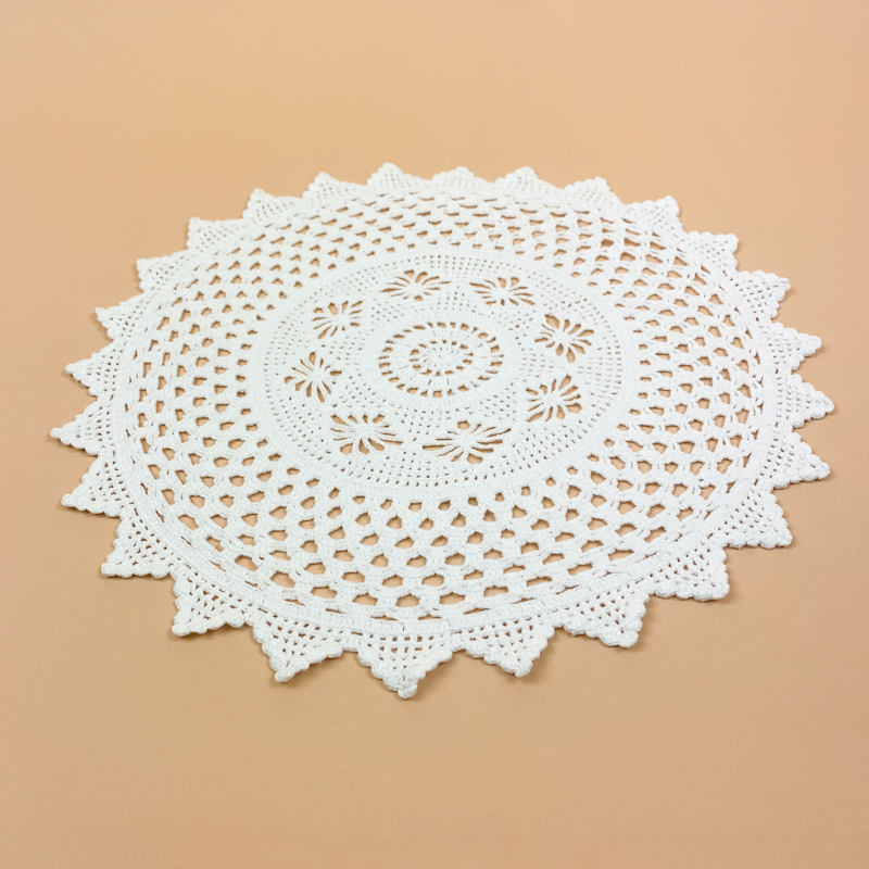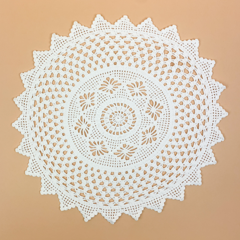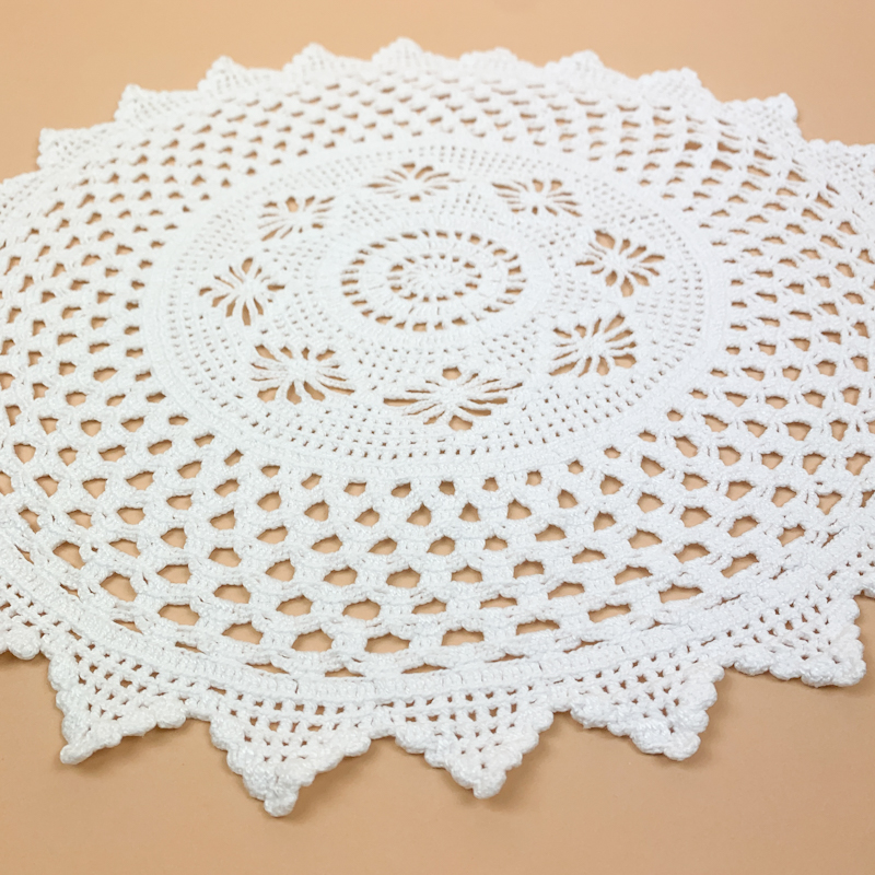 Fremstillet i bomuld med et detaljeret og klassisk hæklemønster.