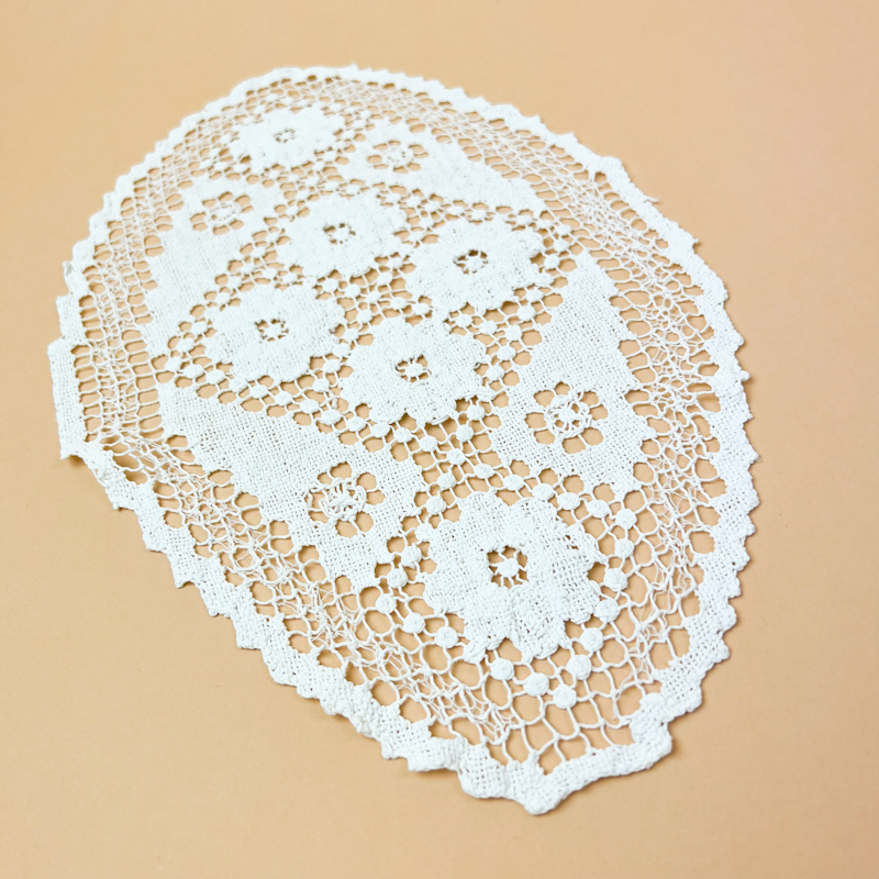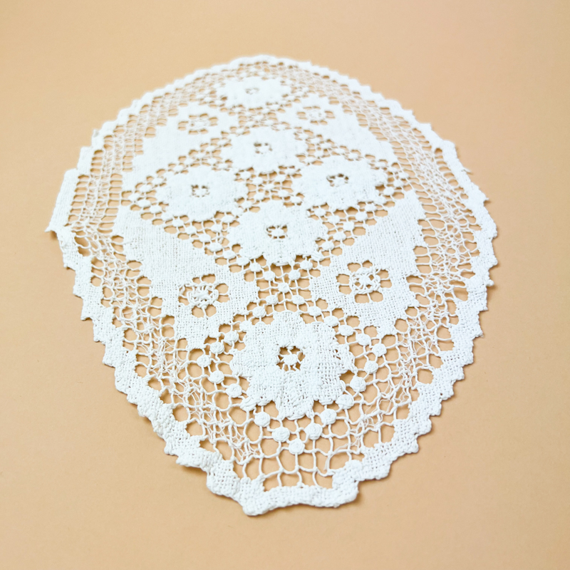 Fin vintage lysedug i hvid med åbent mønster og dekorative blomsterfelter.