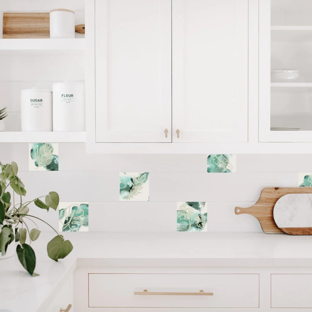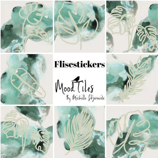 Smukke flisestickers i grønne nuancer med vandfarve effekt fra Moodtiles.