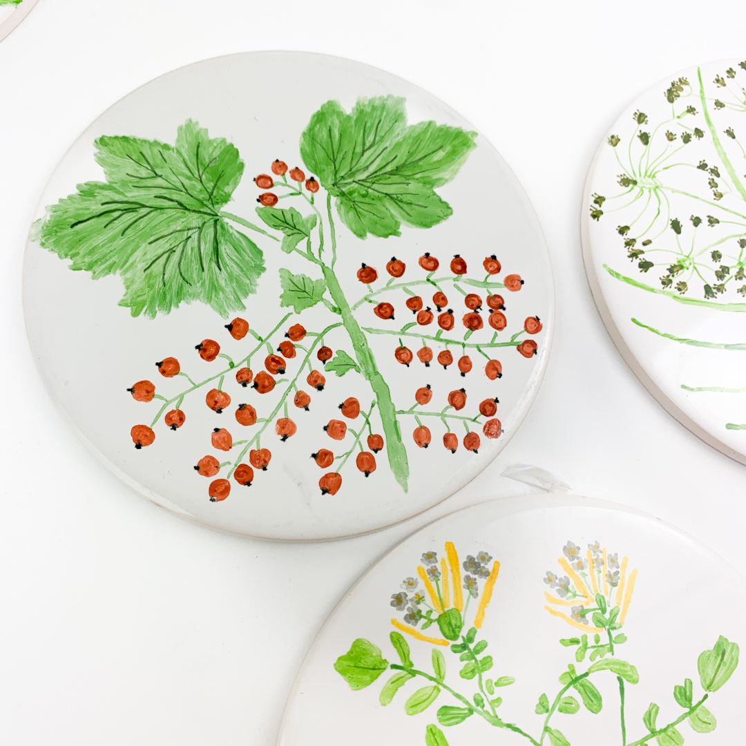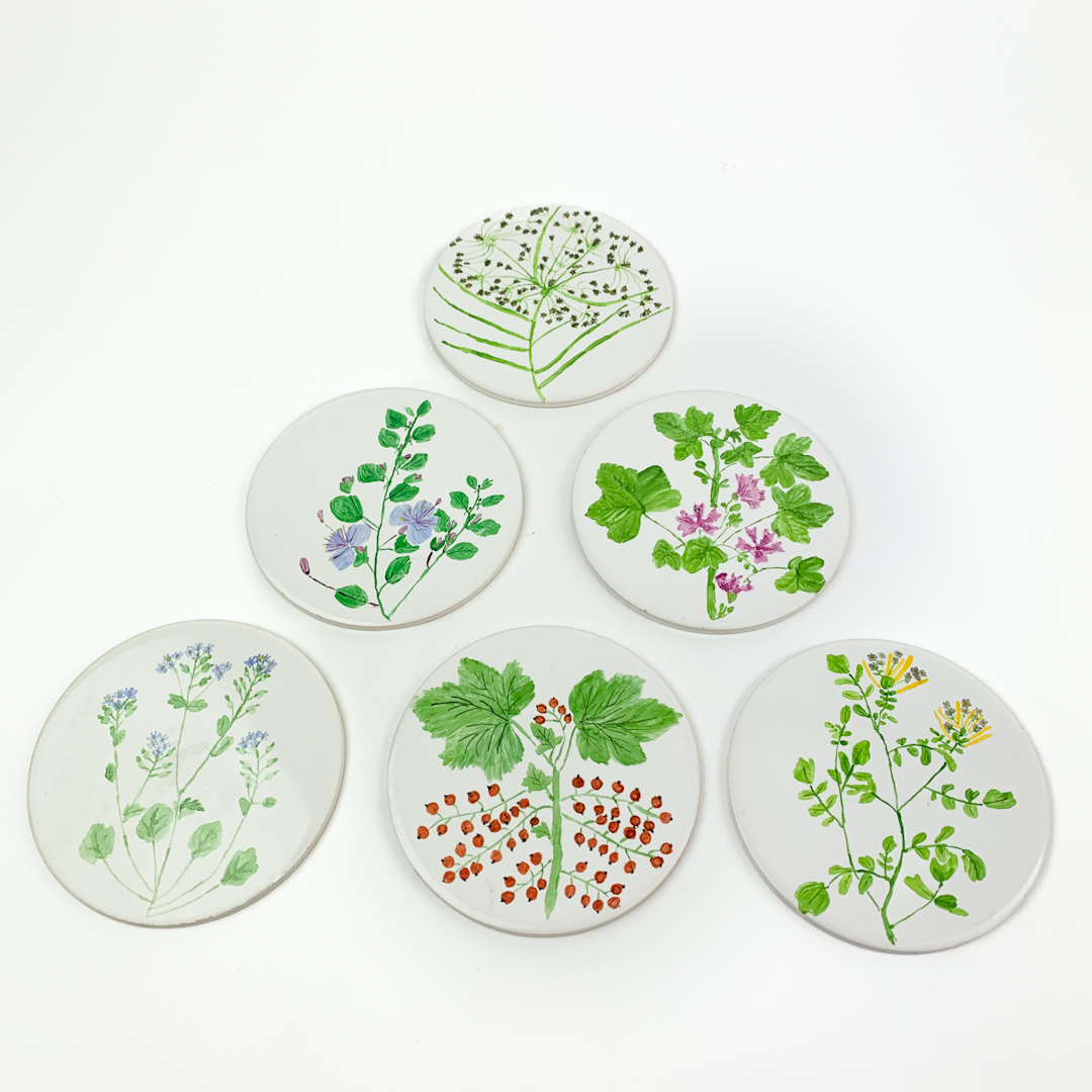 Dekoreret med fine botaniske motiver af urter, bær og blomster i klare farver.