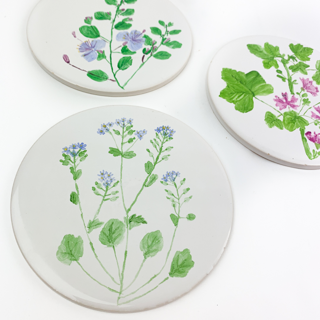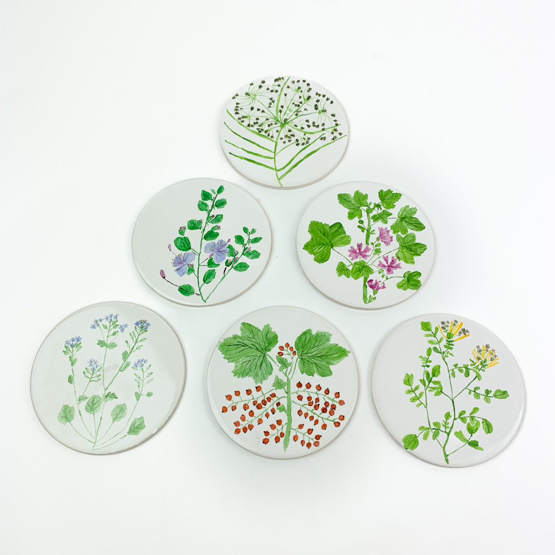 Seks vintage smørebrikker med planter