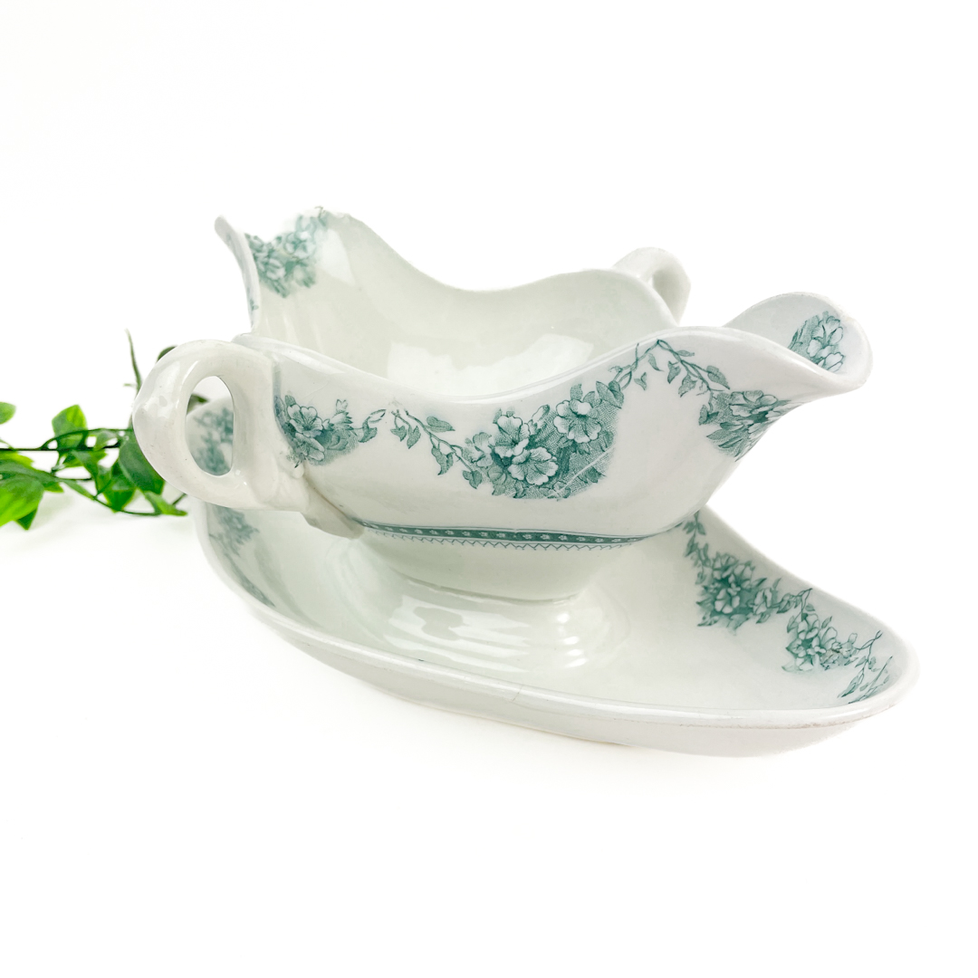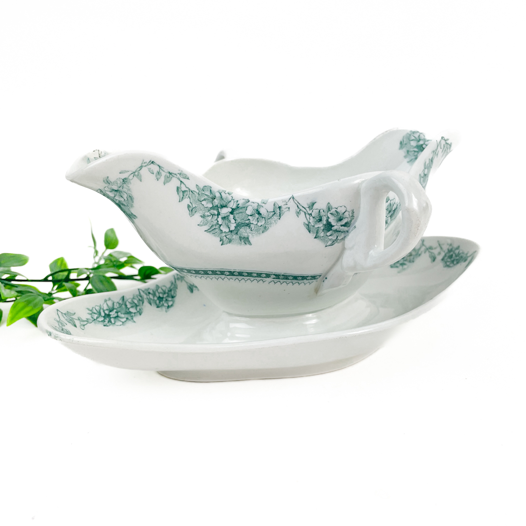 Dekoreret med grønne blomsterbånd langs kanten og klassisk form med fastmonteret underfad.