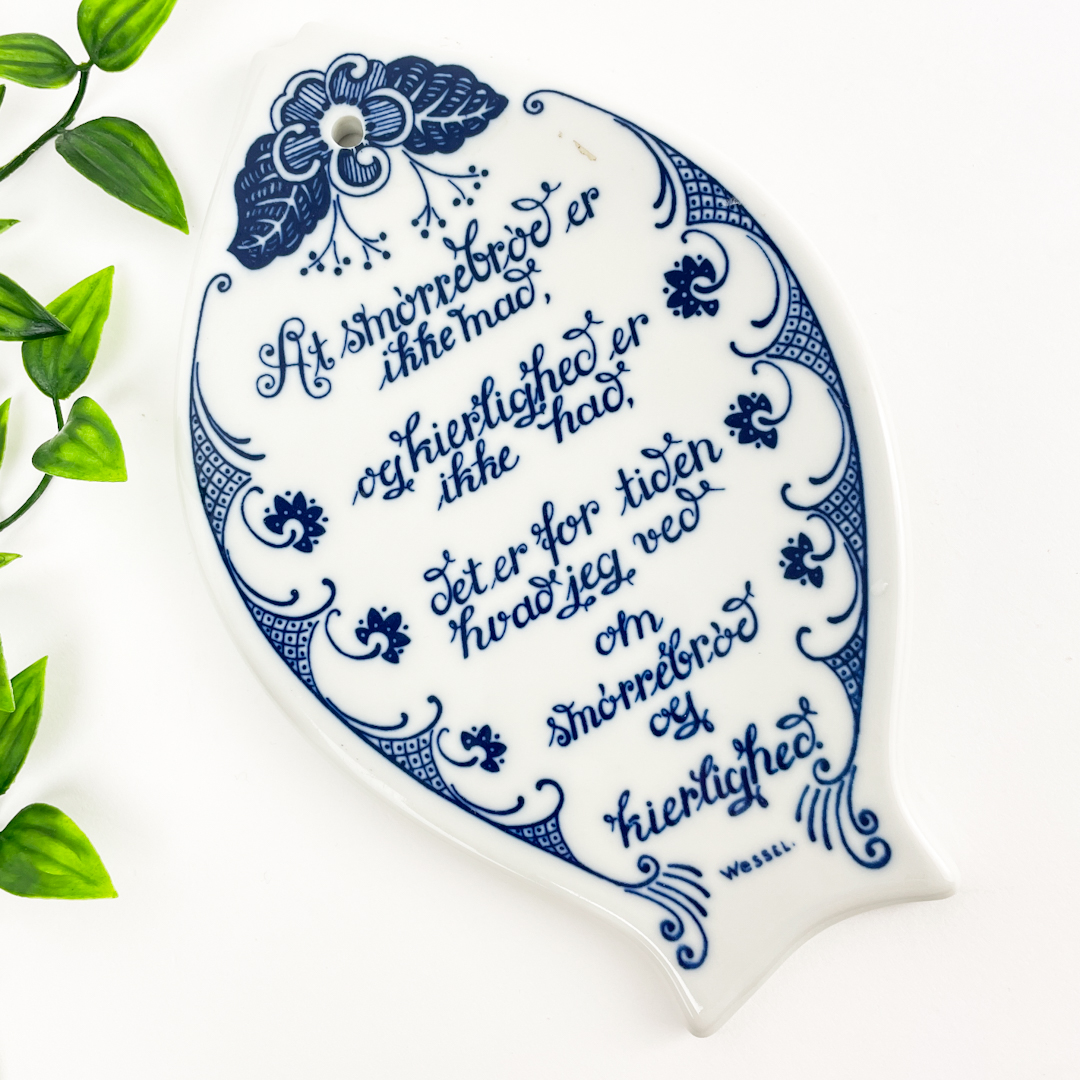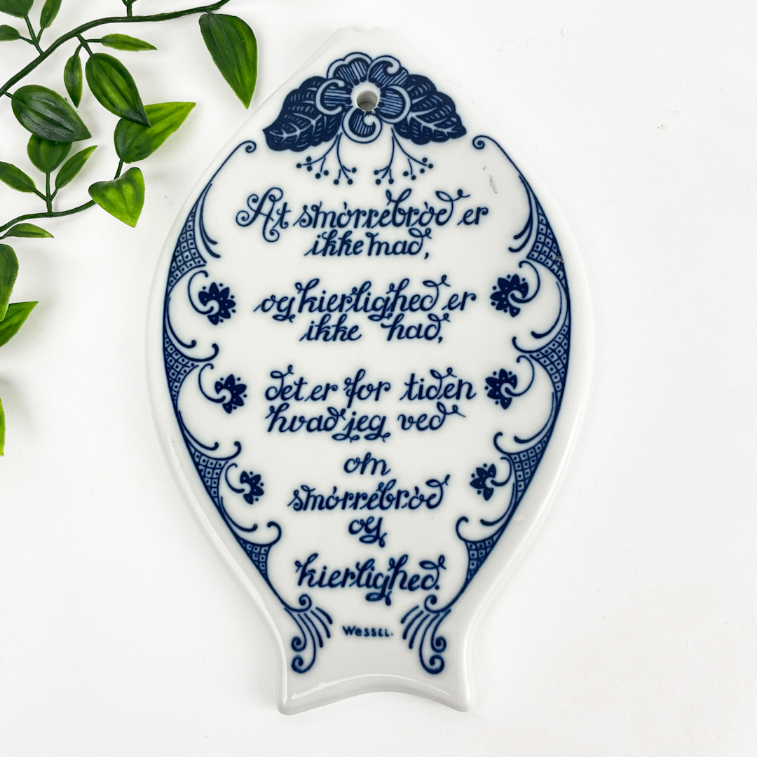 Dekoreret i klassisk blå-hvid stil med tekst af Wessel: