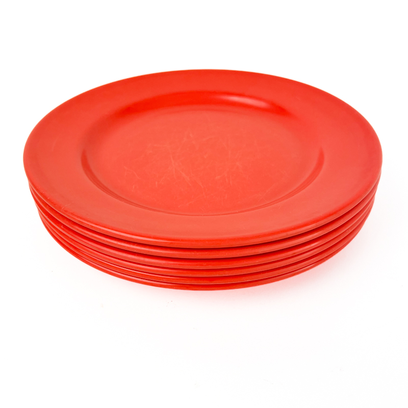 Seks vintage frokosttallerkner fra Rosti i den karakteristiske klare orange farve.