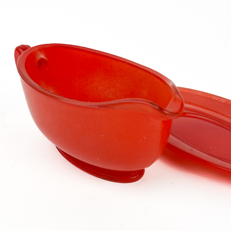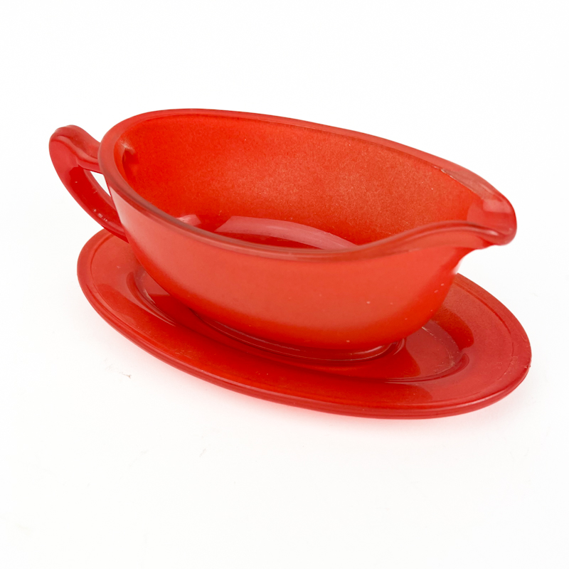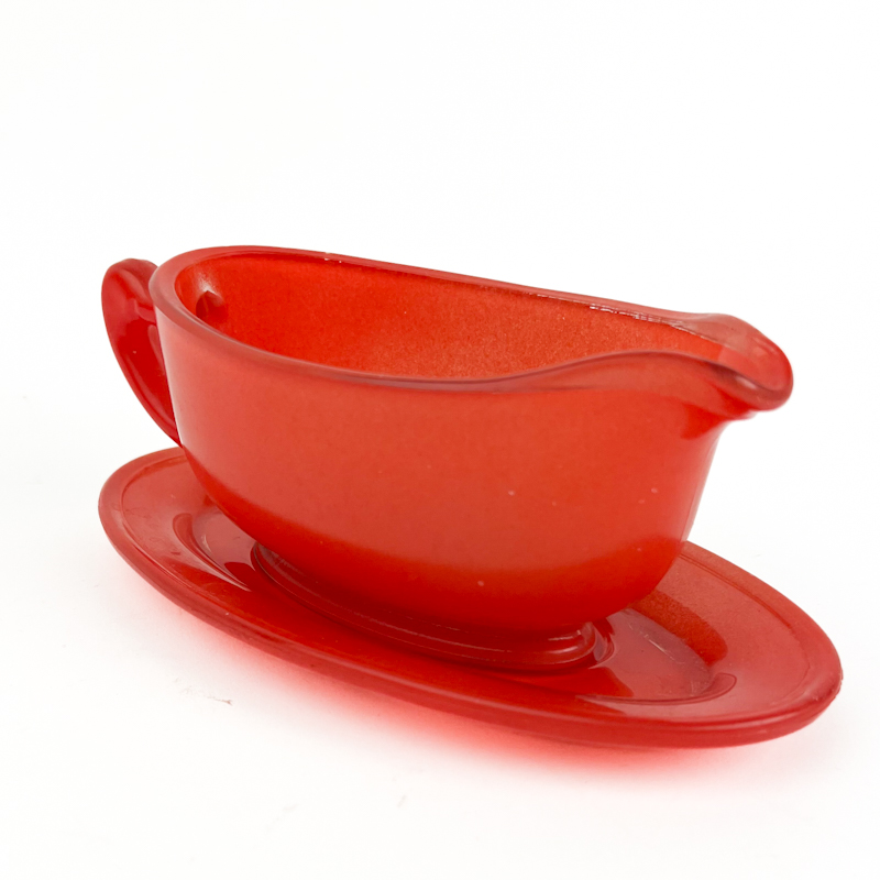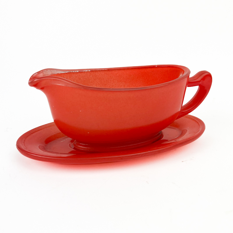 Flot vintage sauceskål i rød støbt glas med tilhørende underfad.