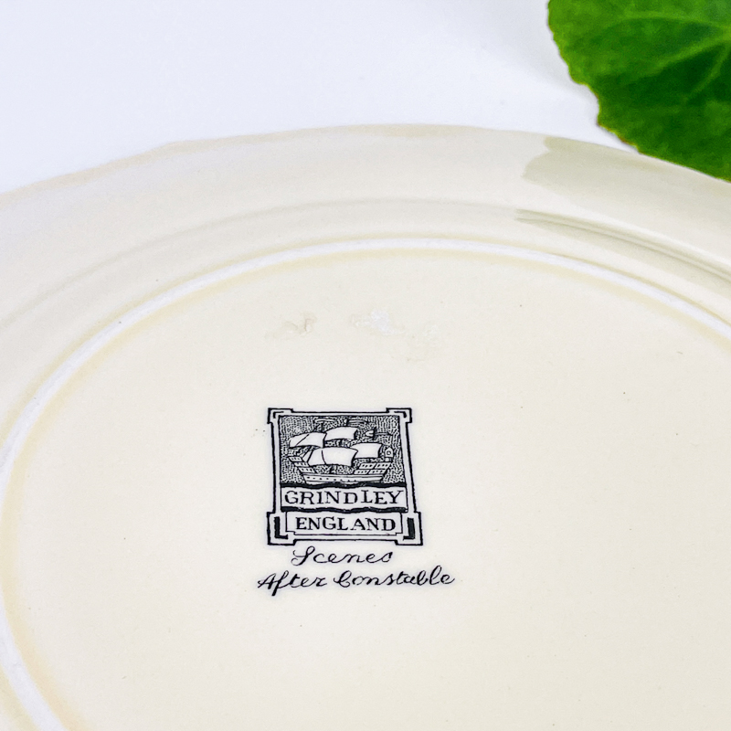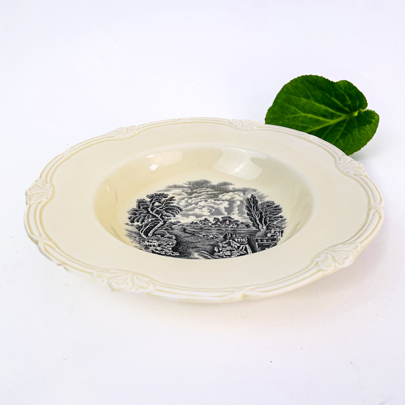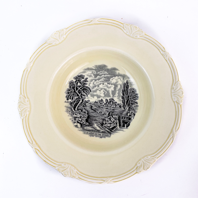 Dybe middagstallerkner fra engelske Grindley "Scenes after Constable", black centerdesign. Ældre engelsk fajance kendes normalt på at bundfarven er lys creme i stedet for hvid. Servicet her har sorte landskabsmotiver.