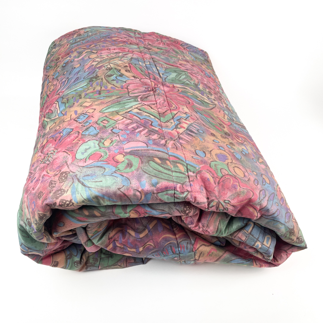 Smukt vintage sengetæppe i ren bomuld med farverigt mønster i rosa, grønne og blå nuancer.