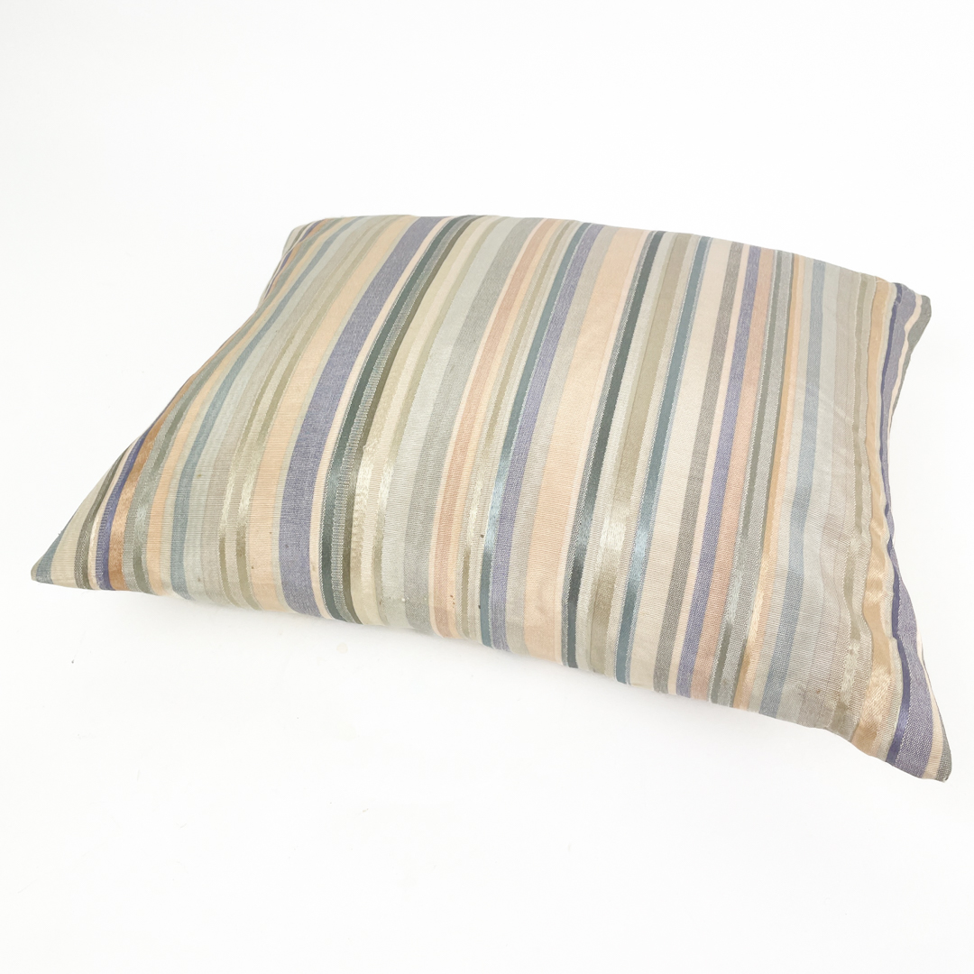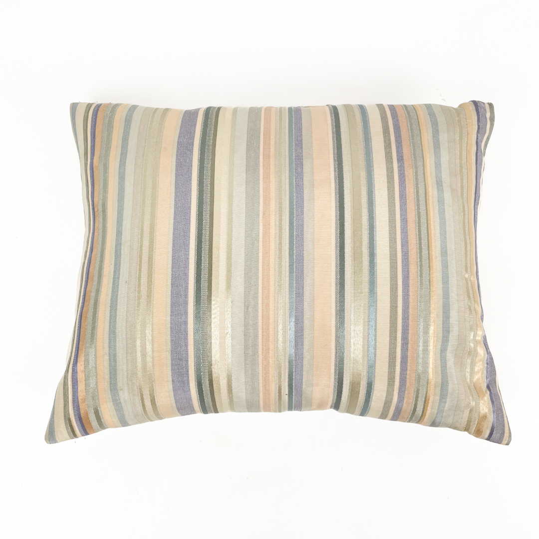 Smuk vintage pyntepude med stribet mønster i afdæmpede nuancer af beige, blå, grøn og grå.