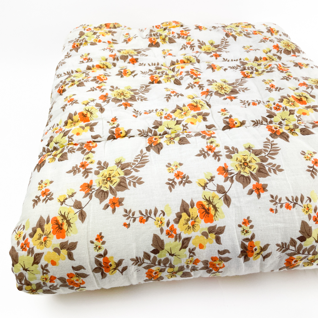 Smukt vintage vattæppe i hvidt med blomster i varme nuancer af orange, gul og brun.