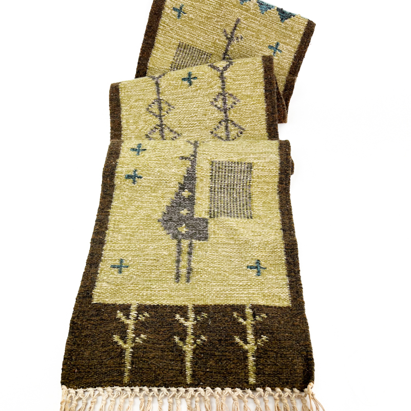 Måler ca. 130 cm i længden uden frynser og ca. 30 cm i bredden.