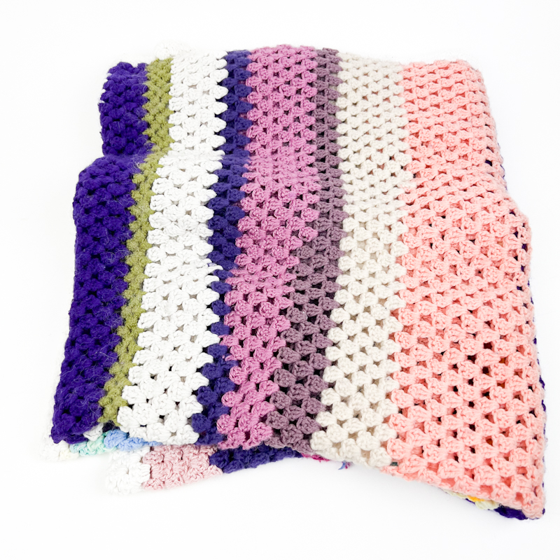 Smukt vintage tæppe i håndhæklet design med brede striber i fine farver.
