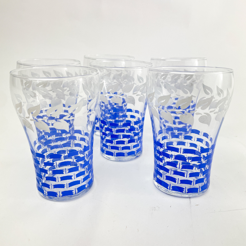 Sæt med seks vintage drikkeglas i klart glas med blåt grafisk mønster og matterede blade.