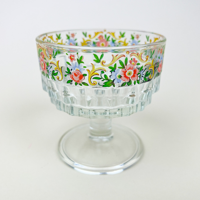 Smuk vintage champagneskål i presset glas med farverig blomsterdekoration langs kanten.