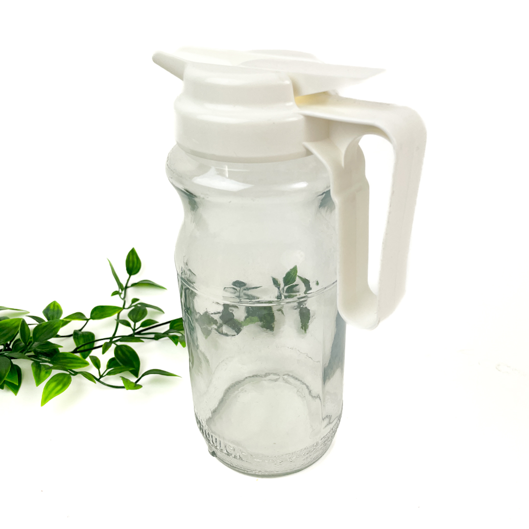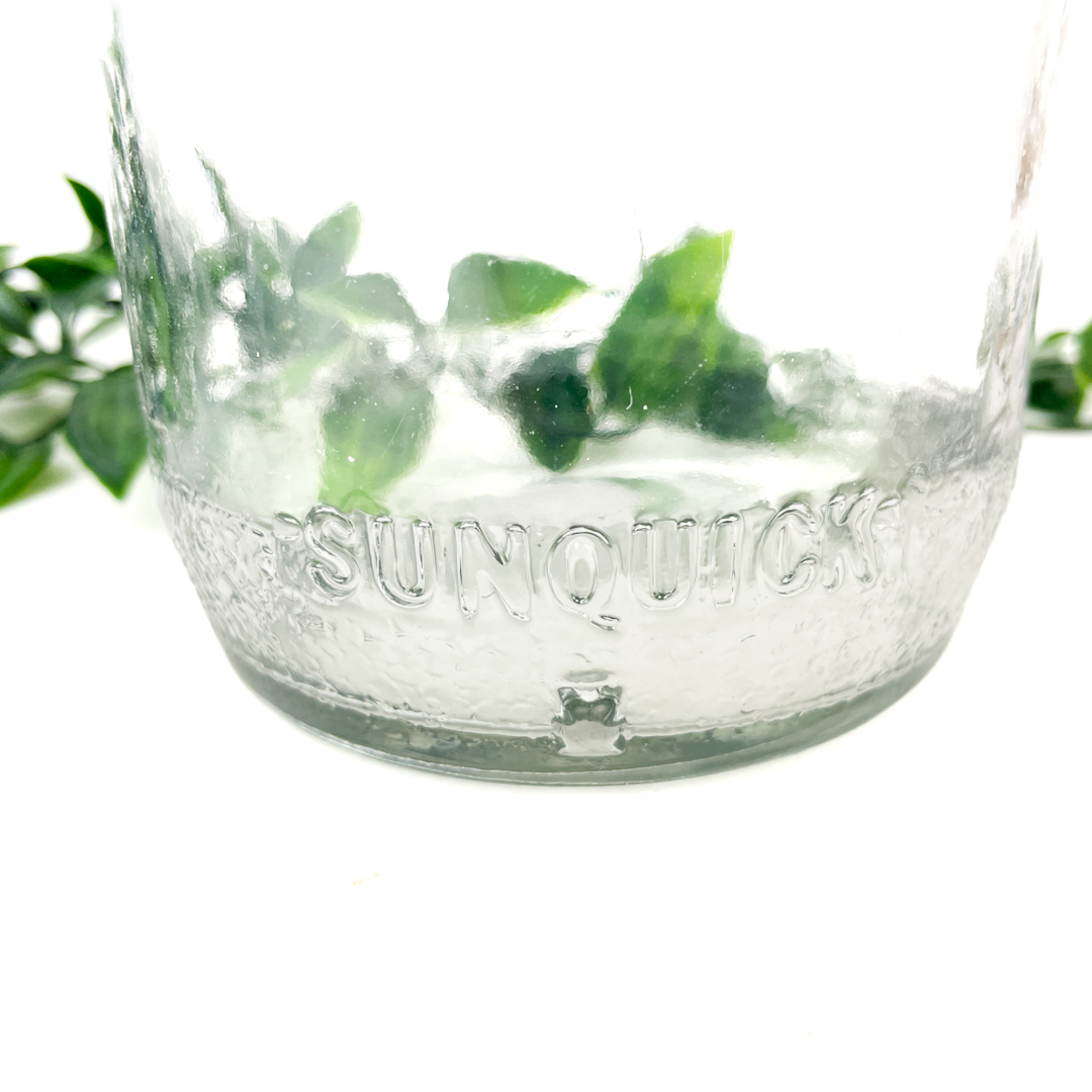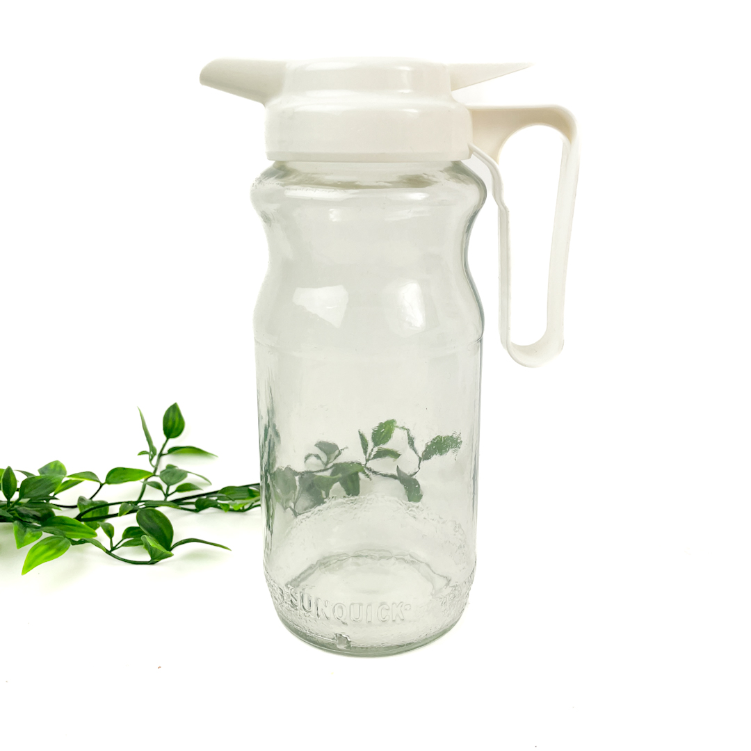 Original Sunquick saftevandskande i glas med hvid hank og skænketud.