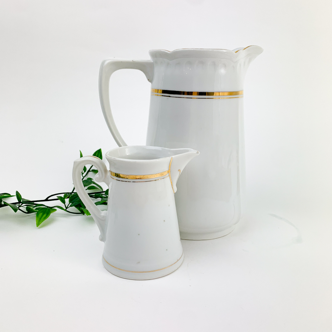 Smukke hvide vintage kander i porcelæn dekoreret med elegant guldkant.