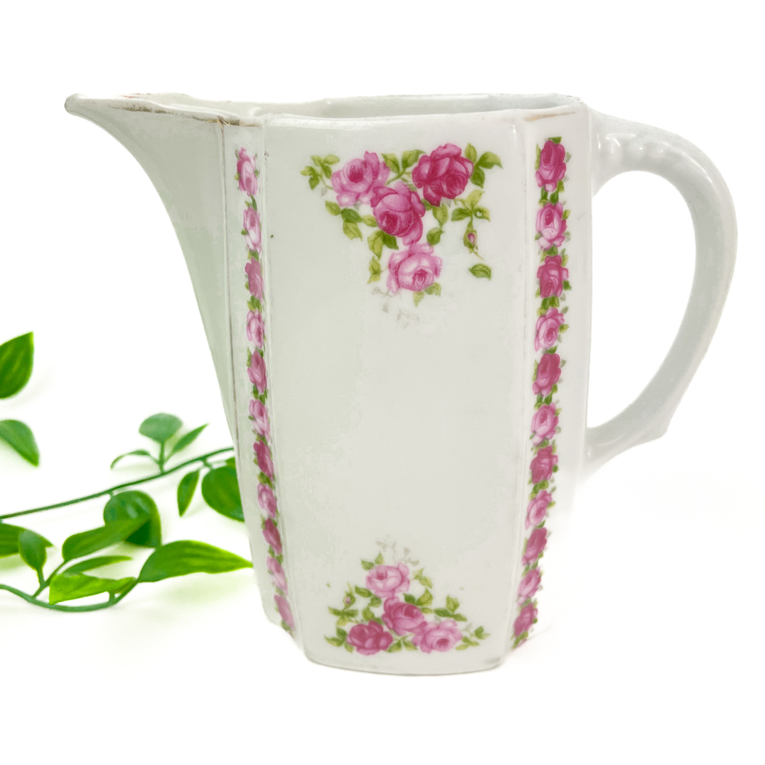 Smuk vintage kande i hvidt porcelæn dekoreret med lyserøde roser og grønne blade i et klassisk, romantisk mønster.