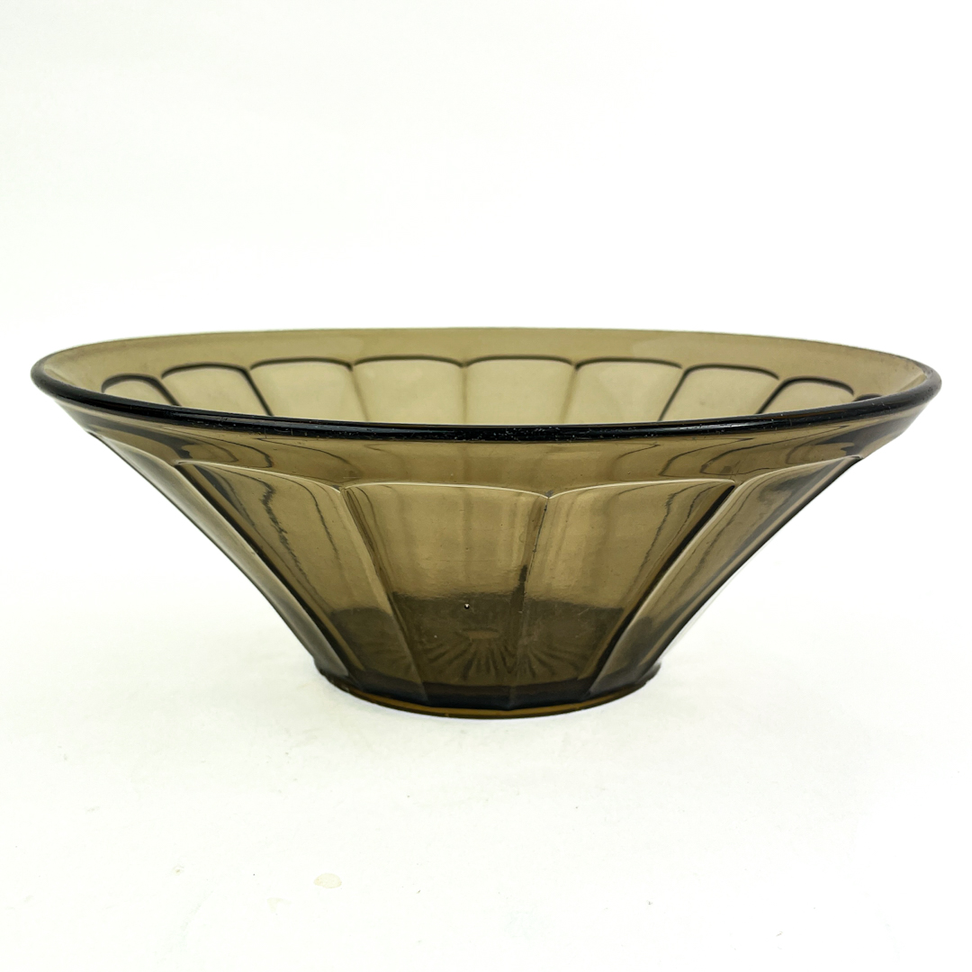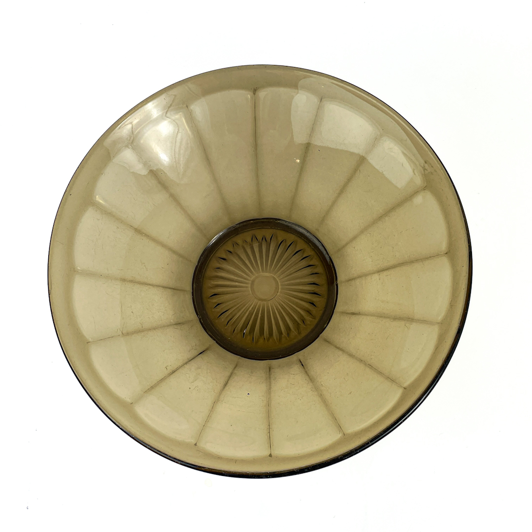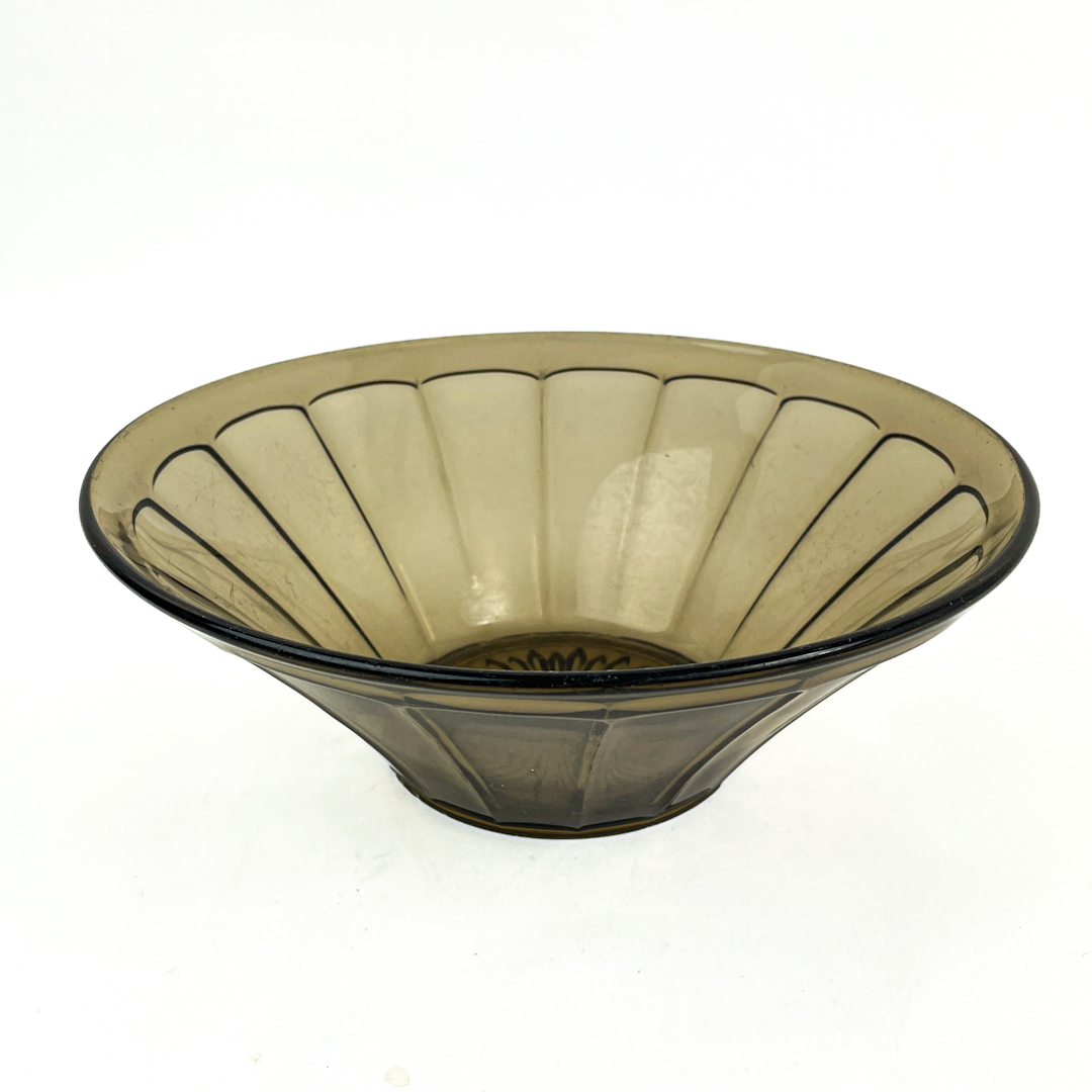Elegant røgfarvet glasskål med blomstret form og markerede felter i glasset.