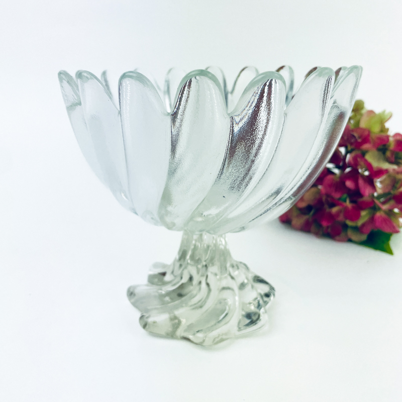 Fremstillet i klart presset glas med bølgeformet kant og dekorativ fod, typisk for det smukke Siebenstern-stel.