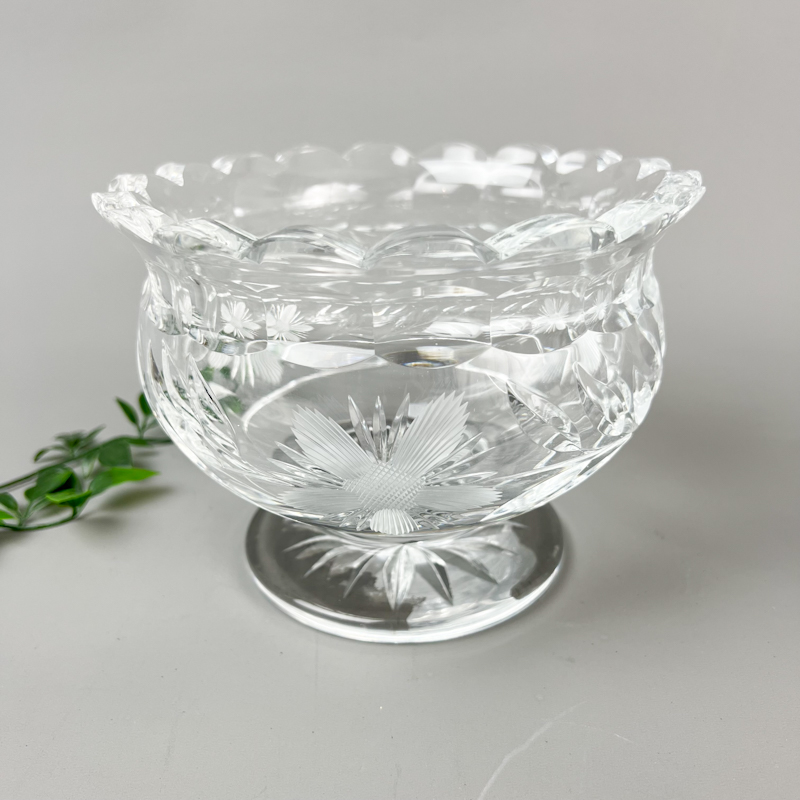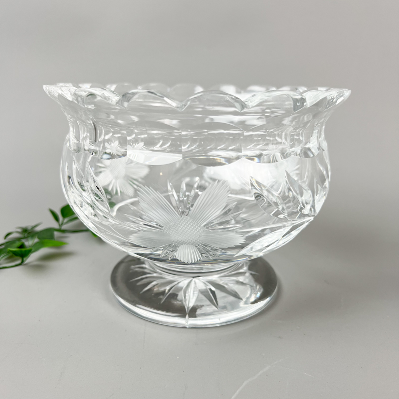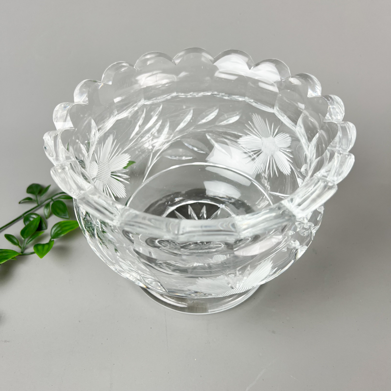 Skålen har bølget kant, slebne blomster- og viftemotiver samt en elegant fod, der løfter formen flot.