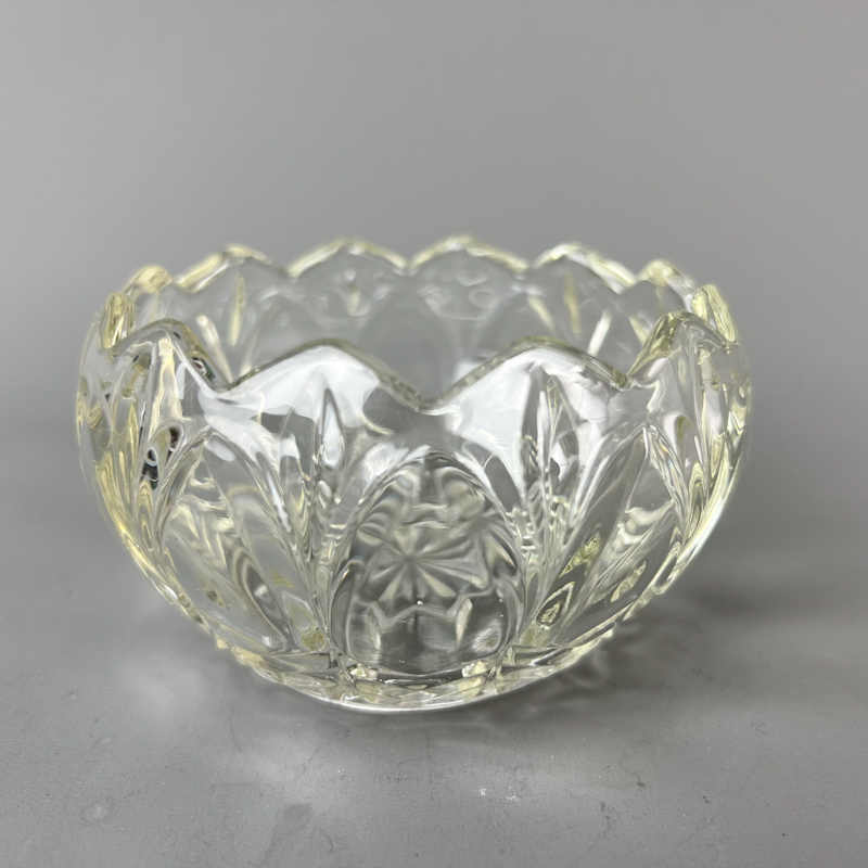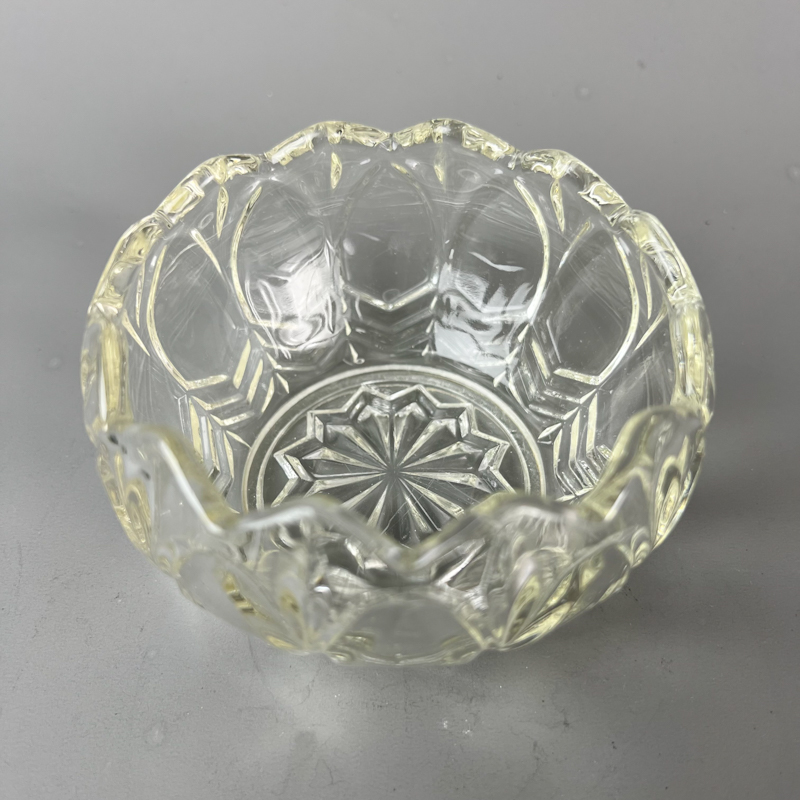 Fin lille vintage skål i kraftigt støbt glas med bølget kant og stjernemønster i bunden.