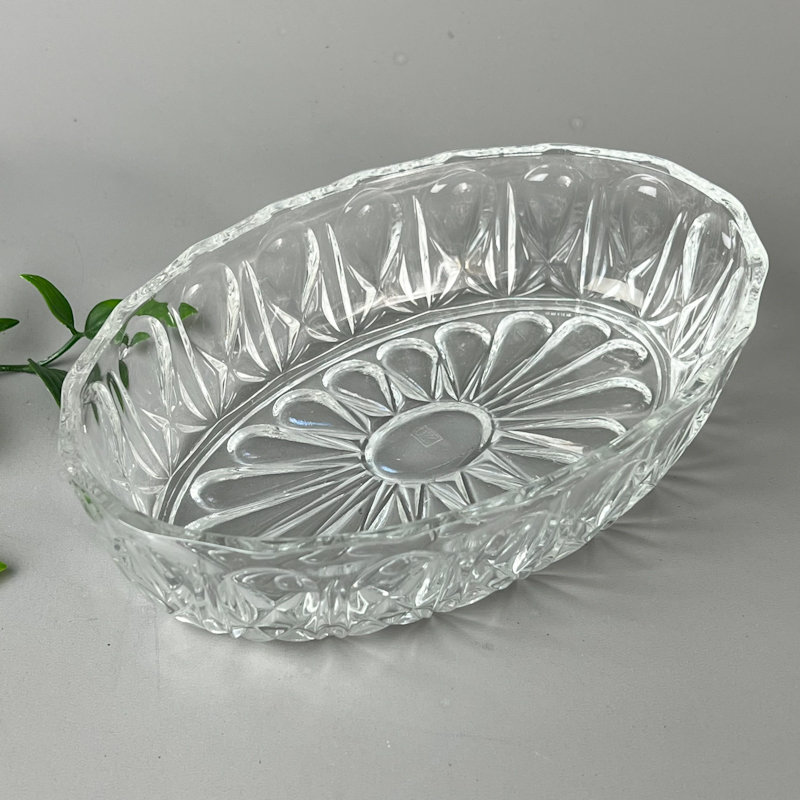 Smuk oval vintage skål i kraftigt støbt glas med dekorativt blomster- og reliefmønster.