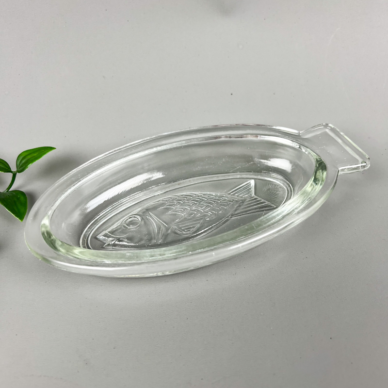 Fin vintage fiskeskål i klart presset glas med klassisk fiskemotiv.