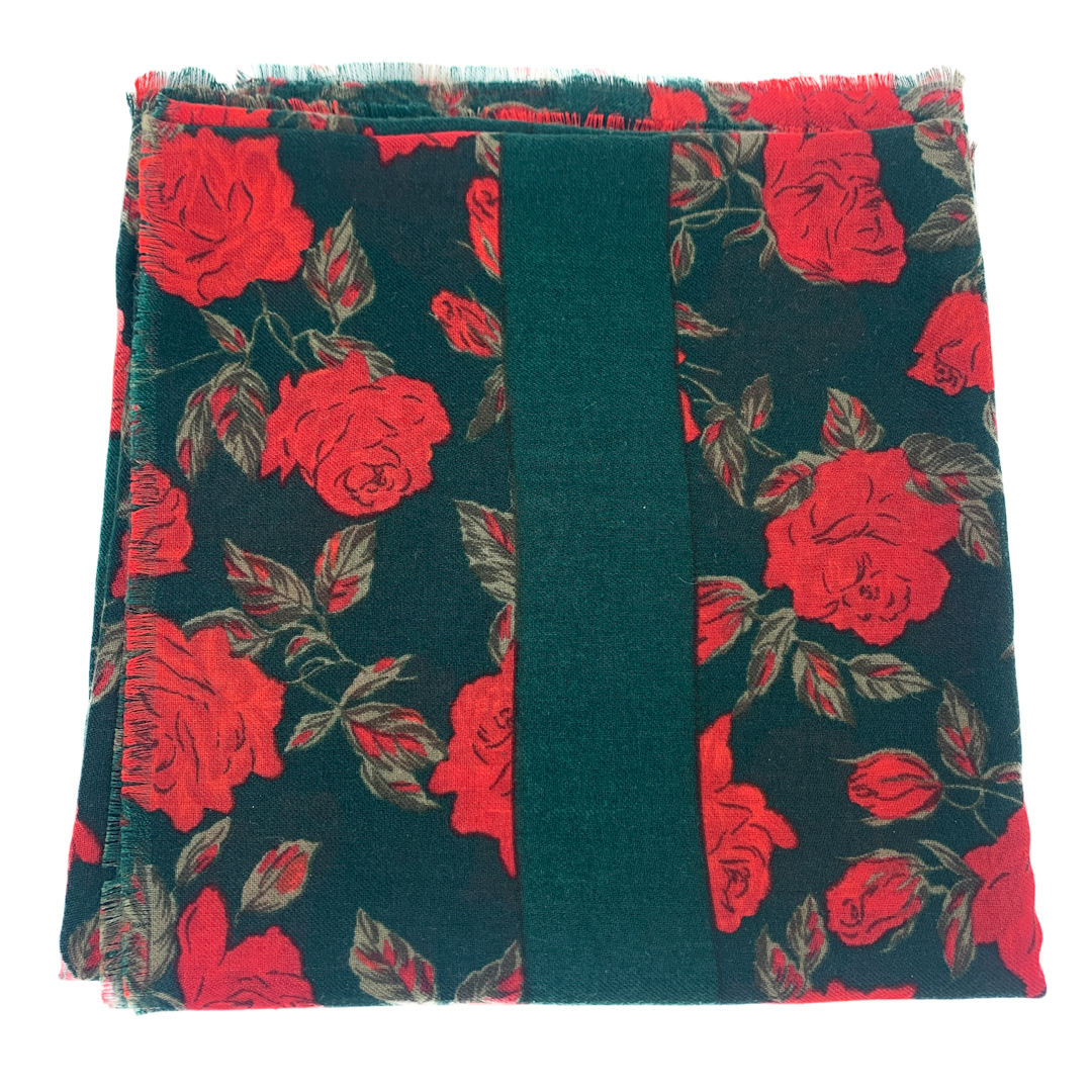 Smukt vintage tørklæde i grøn bundfarve med rødt rosenmønster.