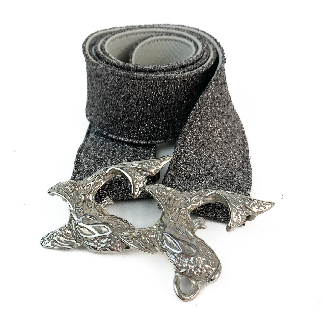 Smukt sølvfarvet vintage bælte i elastisk materiale med blankt spænde formet som to fisk, der mødes i midten.