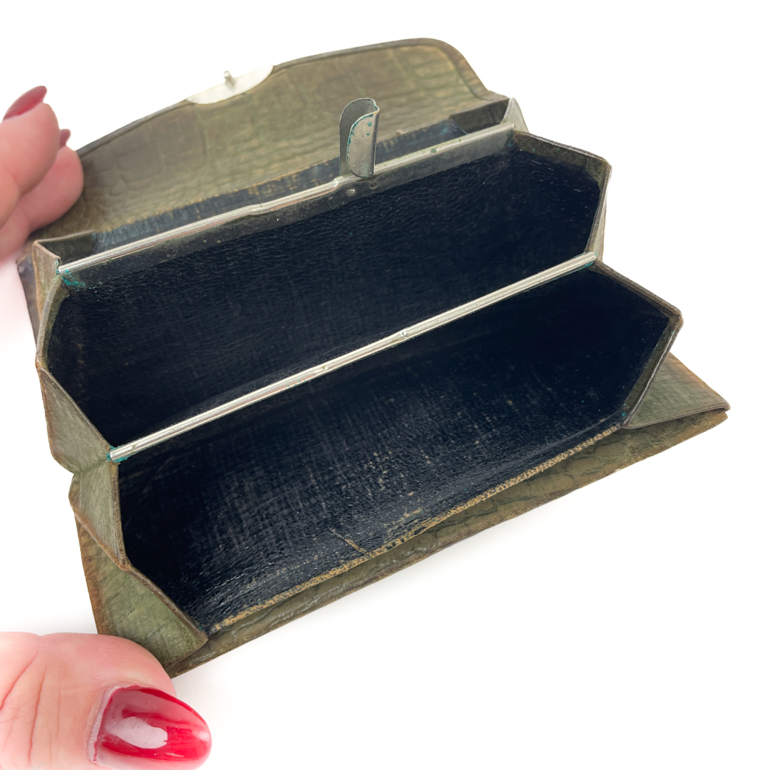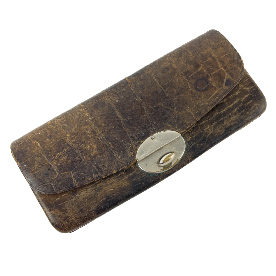 Elegant vintage pung udført i mørkebrunt læder med krokodillepræg.