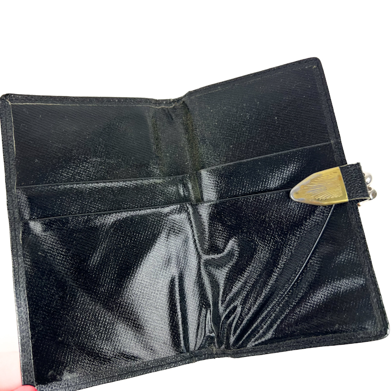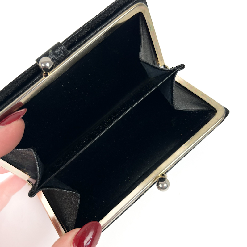 Elegant vintage pung i sort skind med dekorativ gylden frontdetalje og klassisk kuglelukning i metal.