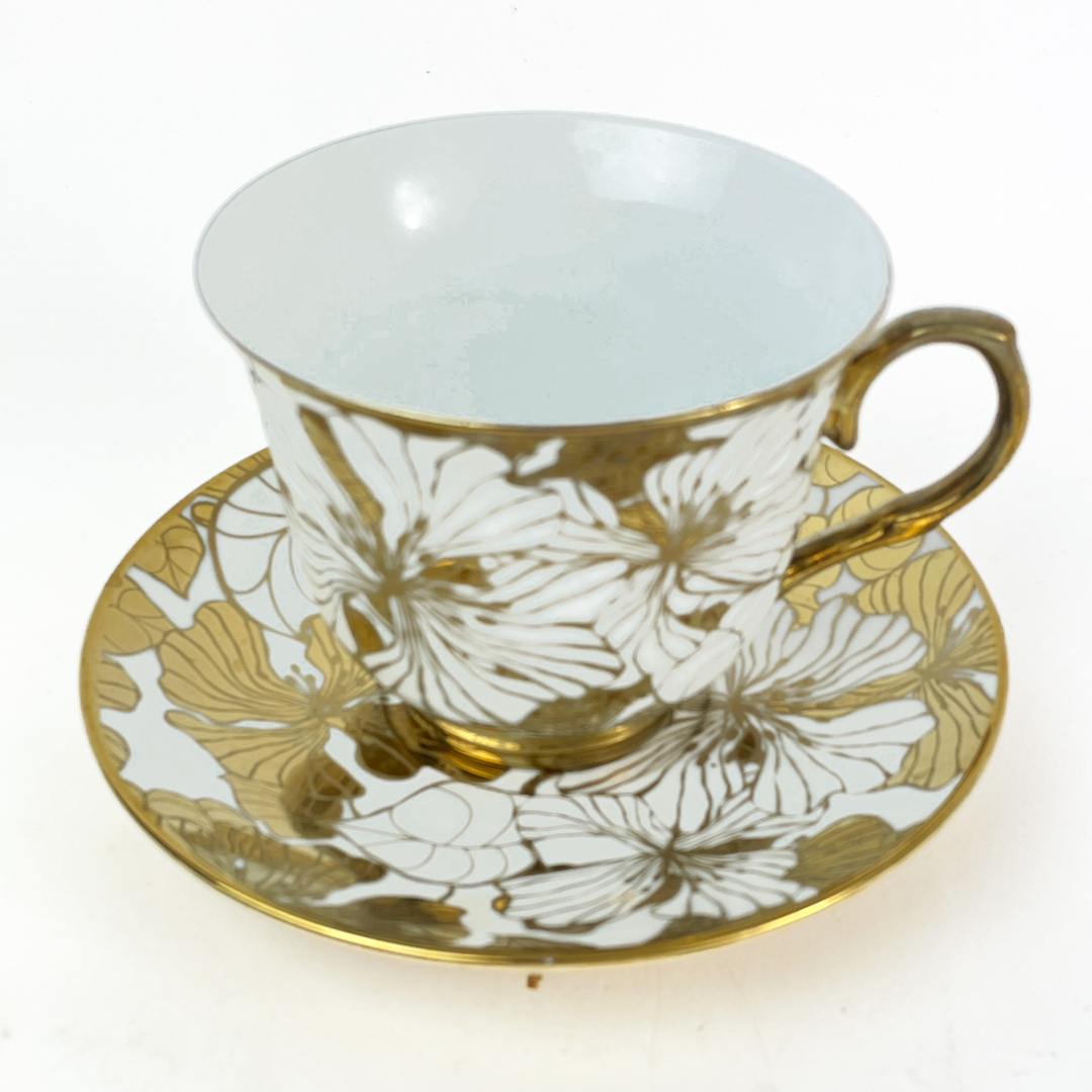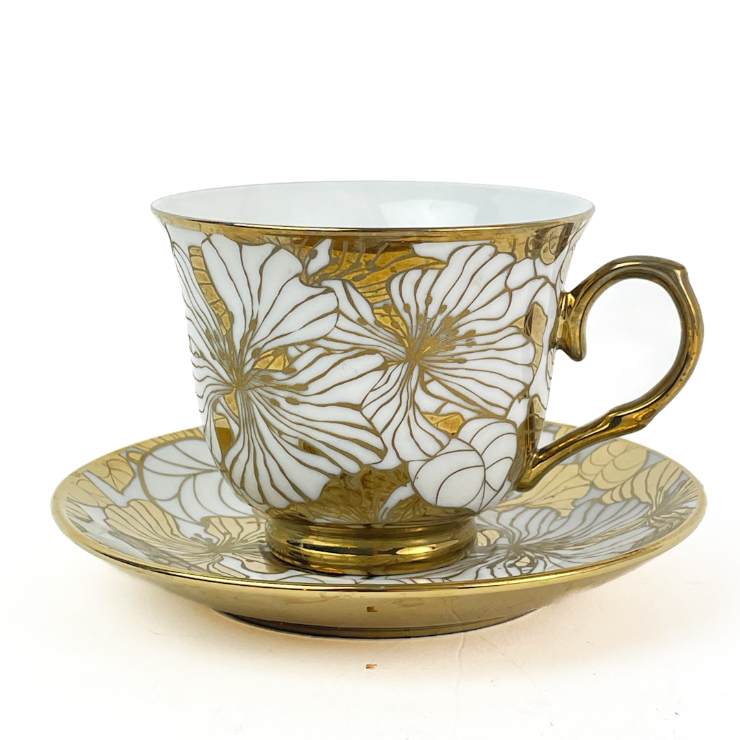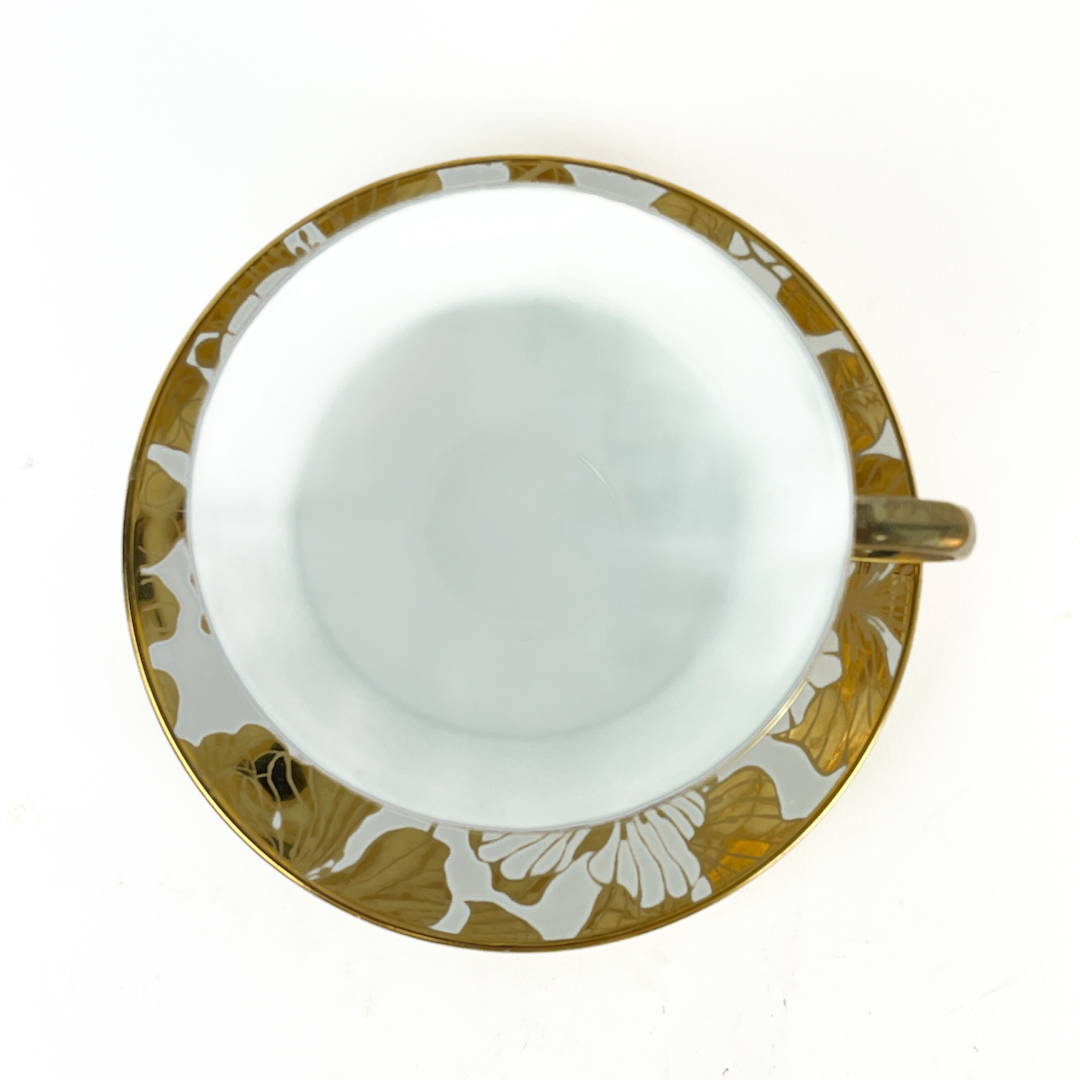 Smuk vintage tekop i porcelæn med elegant hvid og gylden dekoration.