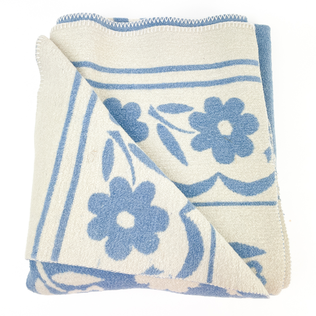 Farverne står flot i blå og råhvid, og mønstret er vævet dobbelt, så det vender modsat på bagsiden.