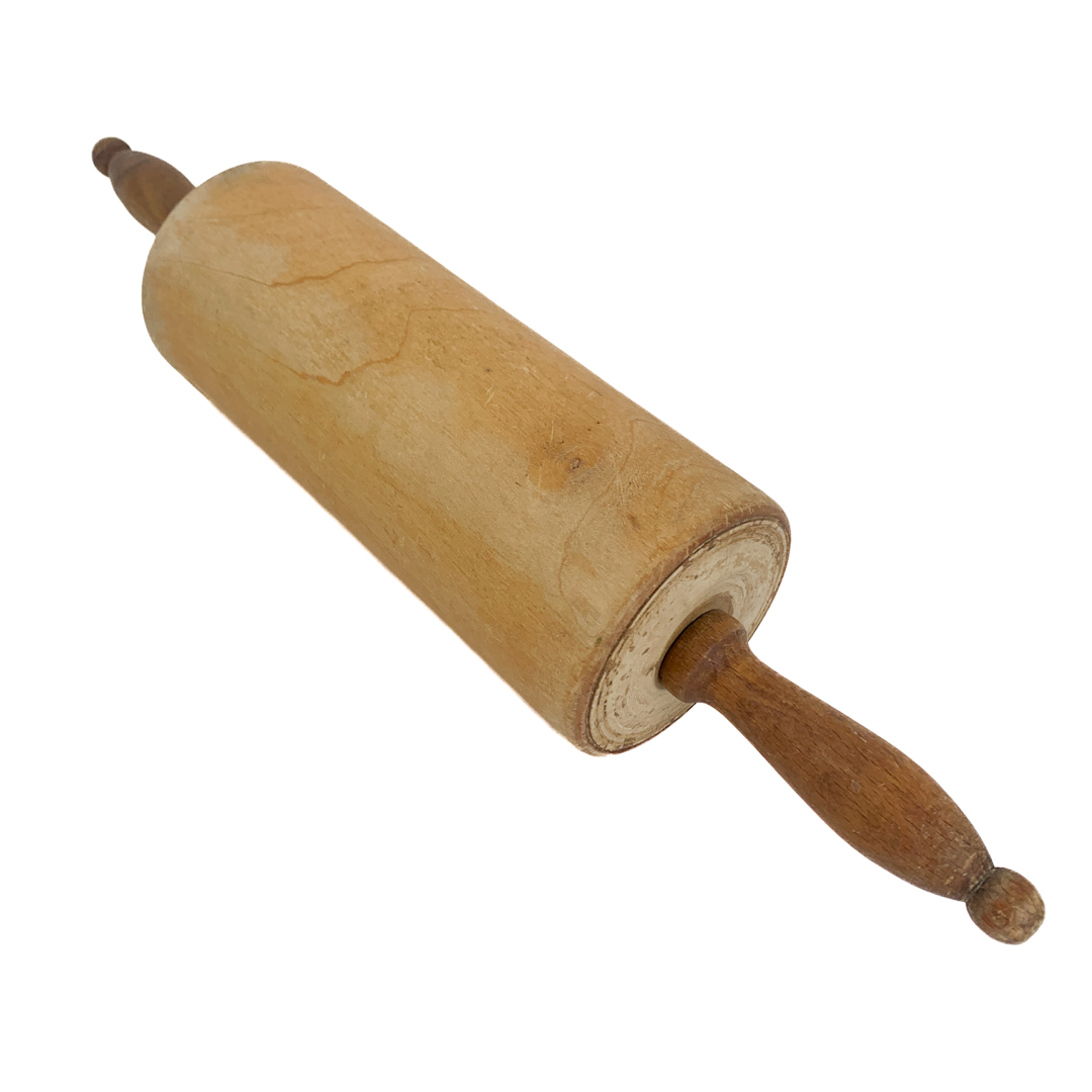 Klassisk vintage kagerulle i lyst træ med drejede håndtag i mørkere træ.