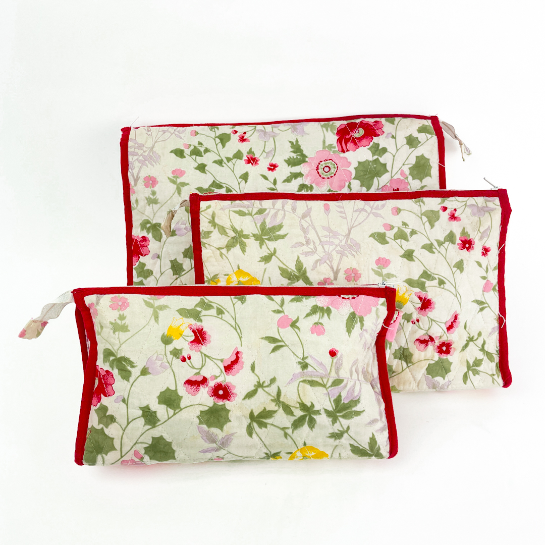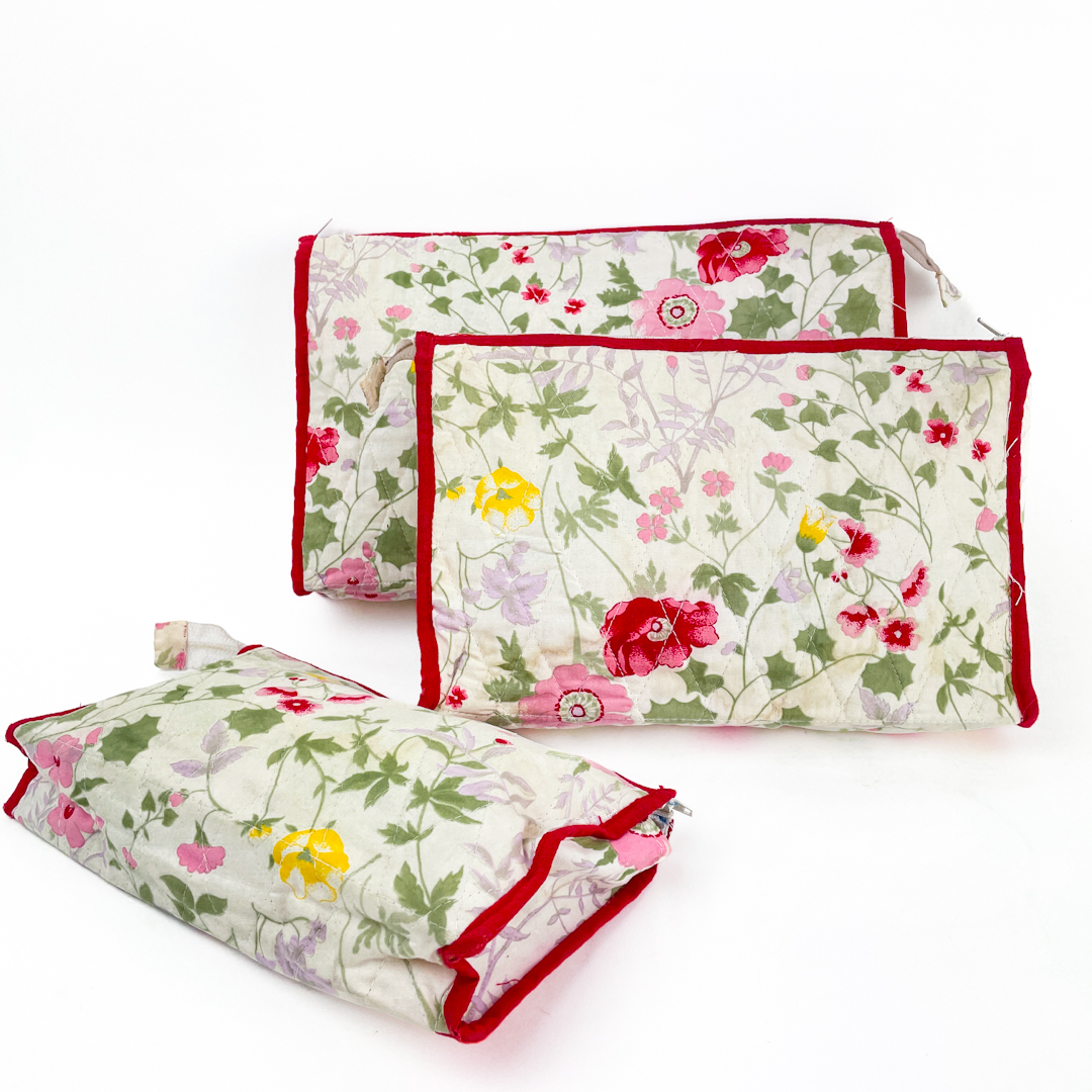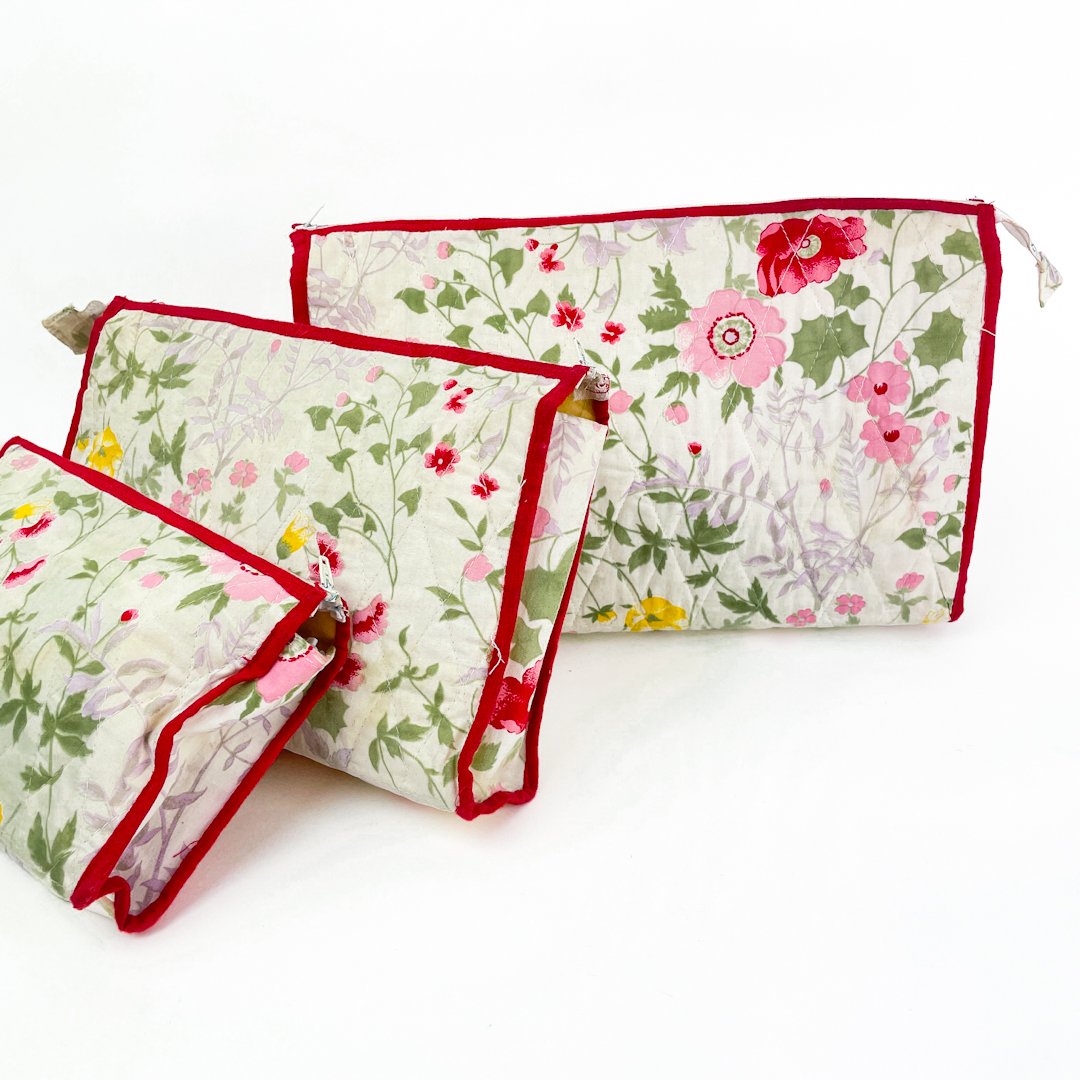 To smukke retro toilettasker og en matchende kosmetikpung i vatteret bomuld med blomster i røde, lyserøde og grønne nuancer.