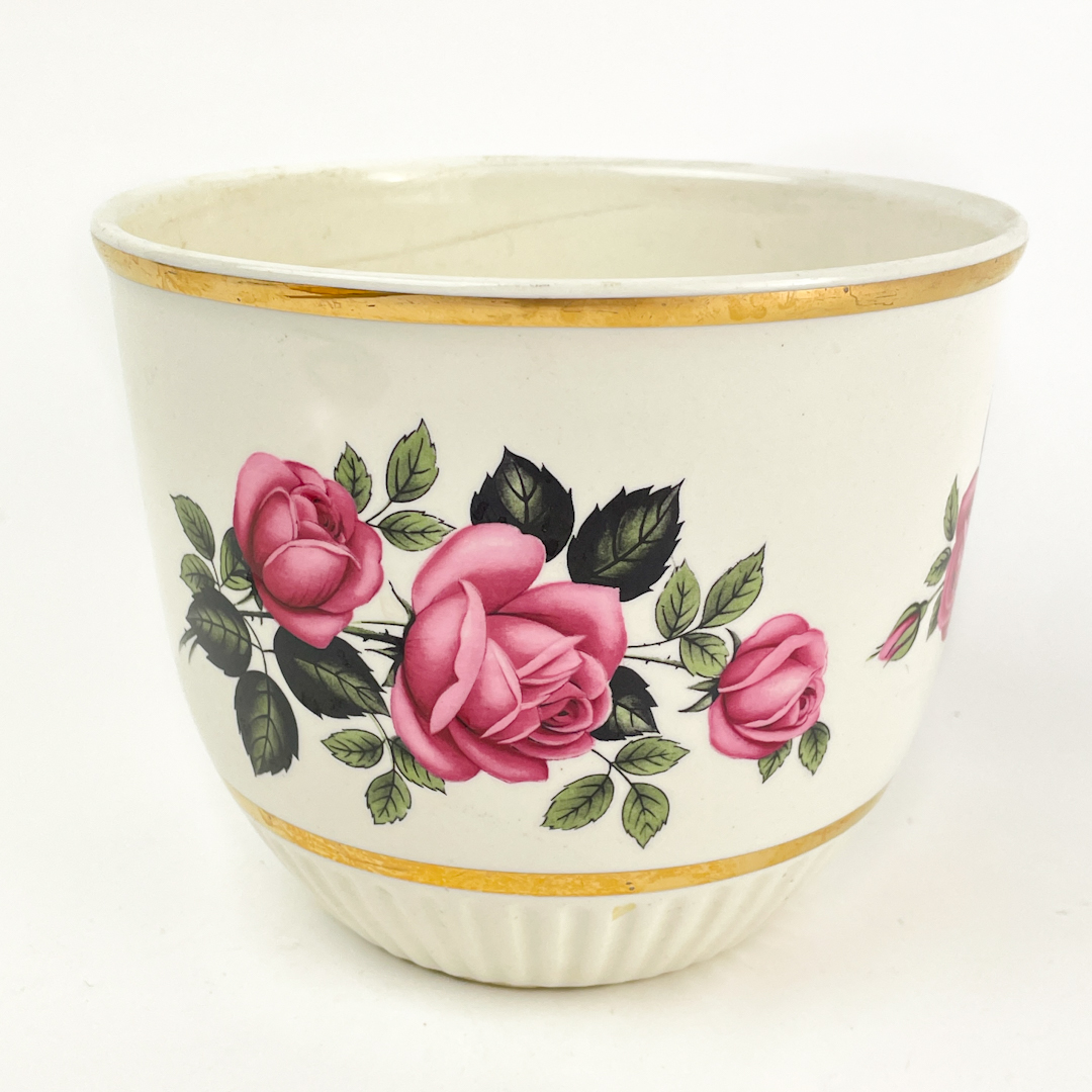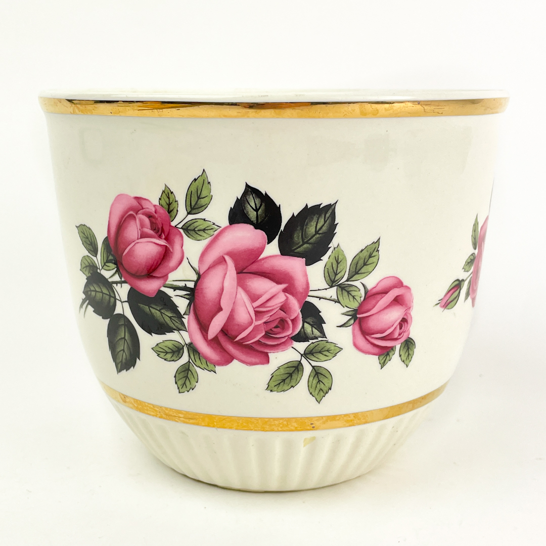Fremstillet i glaseret stentøj med riflet mønster og to dekorative hanke i siderne.